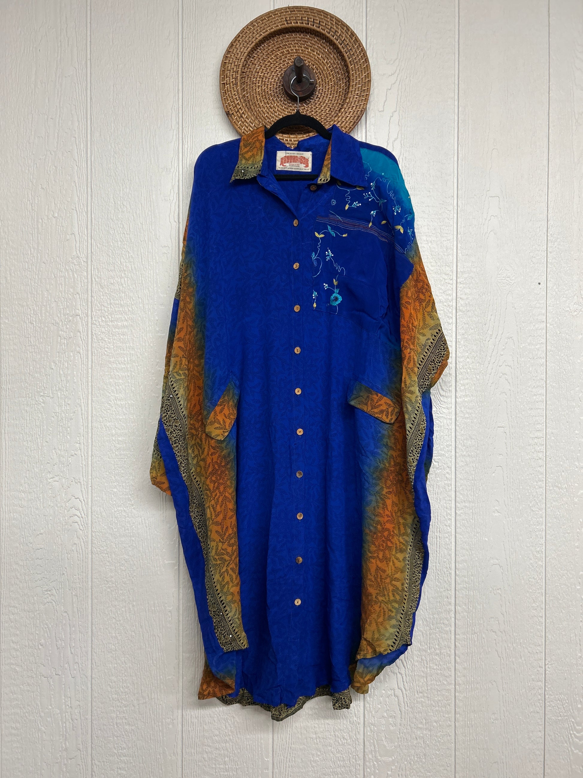 Made from our vintage crepe sari, this billowy dream functional buttons, two deep pockets in the front, dreamy longsleeves and a curved bottom.