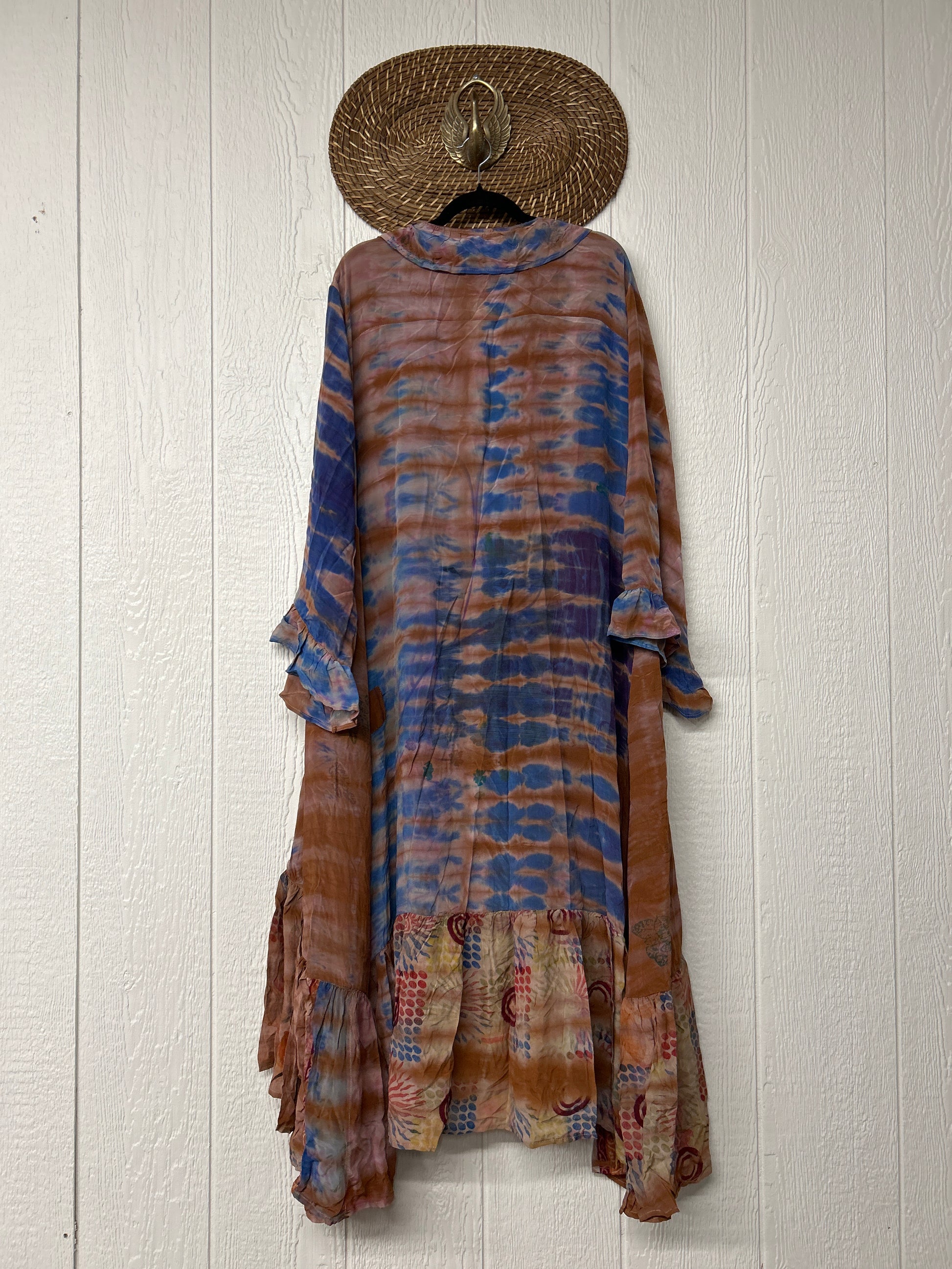 Our pixie duster is pure magic! crafted from ultra lux vintage crepe sari this ethereal layer features ruffles all the way around the outer hem, bell sleeves, double tie closure & high low hem for extra dimension size recommended 00-22/24