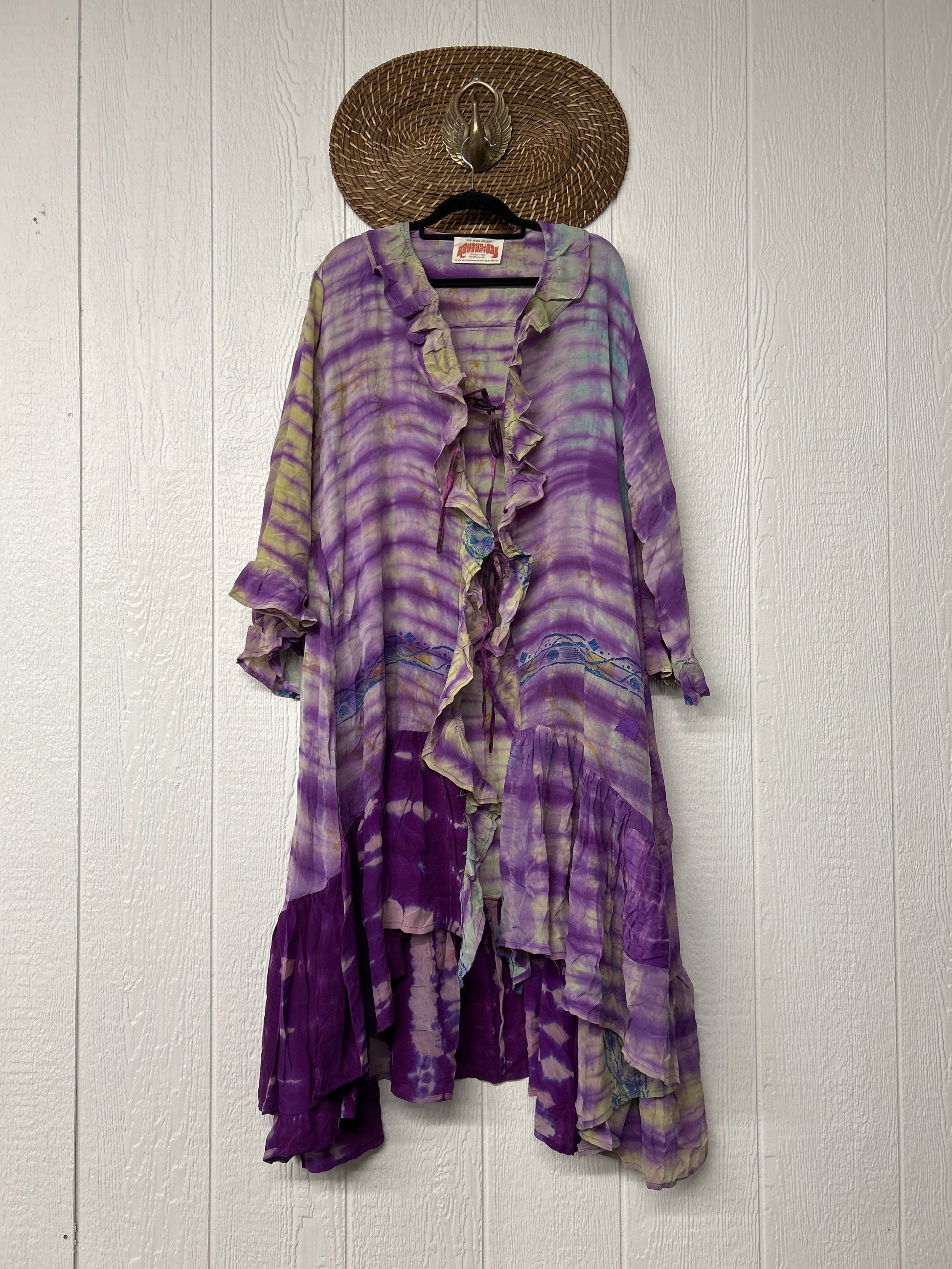 Our pixie duster is pure magic! crafted from ultra lux vintage crepe sari this ethereal layer features ruffles all the way around the outer hem, bell sleeves, double tie closure & high low hem for extra dimension size recommended 00-22/24