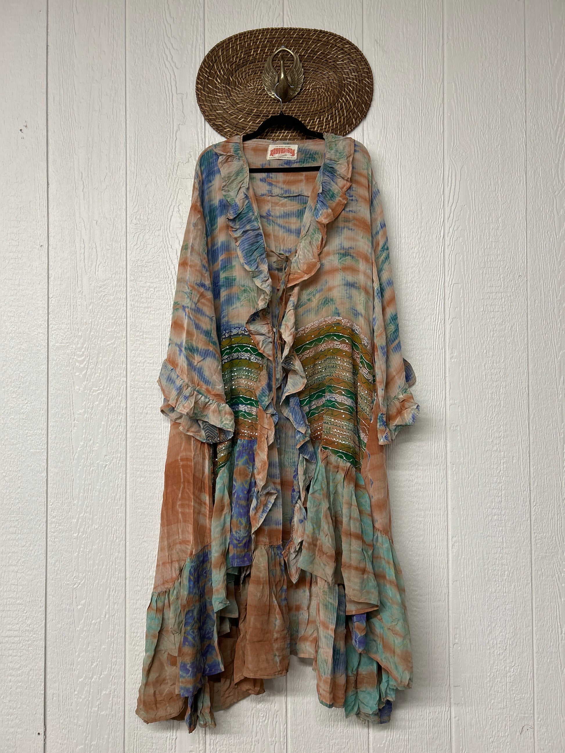 Our pixie duster is pure magic! crafted from ultra lux vintage crepe sari this ethereal layer features ruffles all the way around the outer hem, bell sleeves, double tie closure & high low hem for extra dimension size recommended 00-22/24