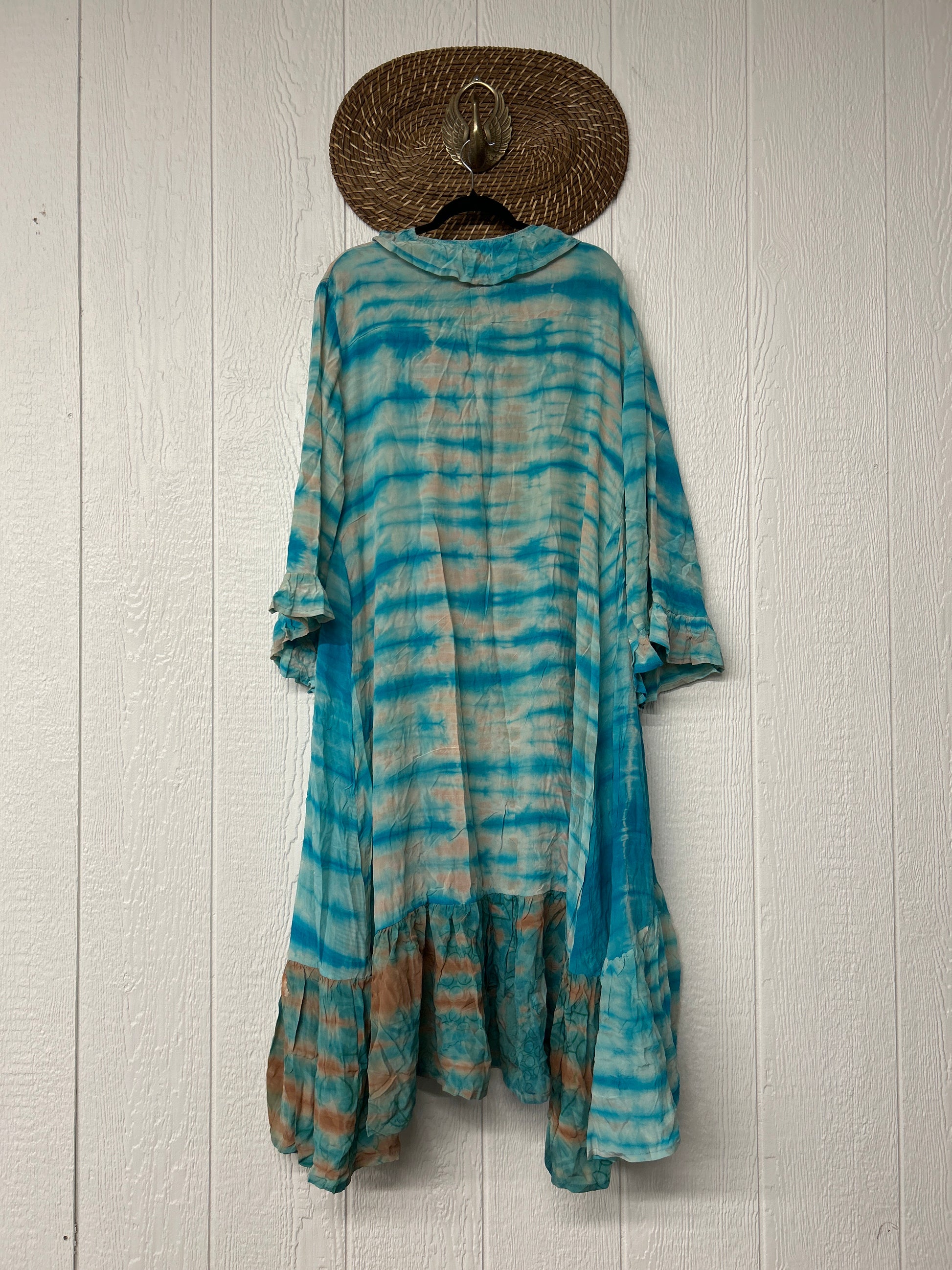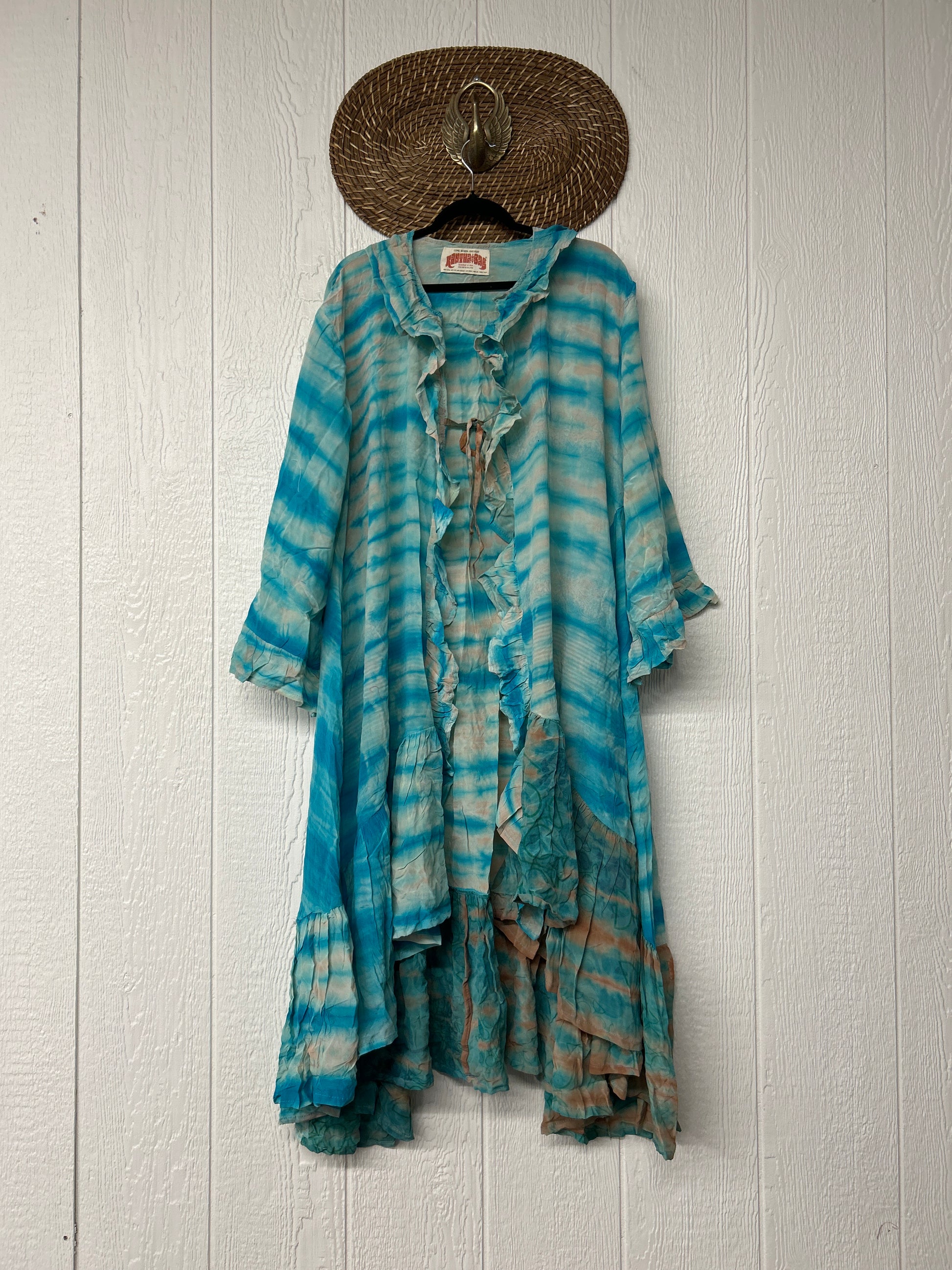 Our pixie duster is pure magic! crafted from ultra lux vintage crepe sari this ethereal layer features ruffles all the way around the outer hem, bell sleeves, double tie closure & high low hem for extra dimension size recommended 00-22/24