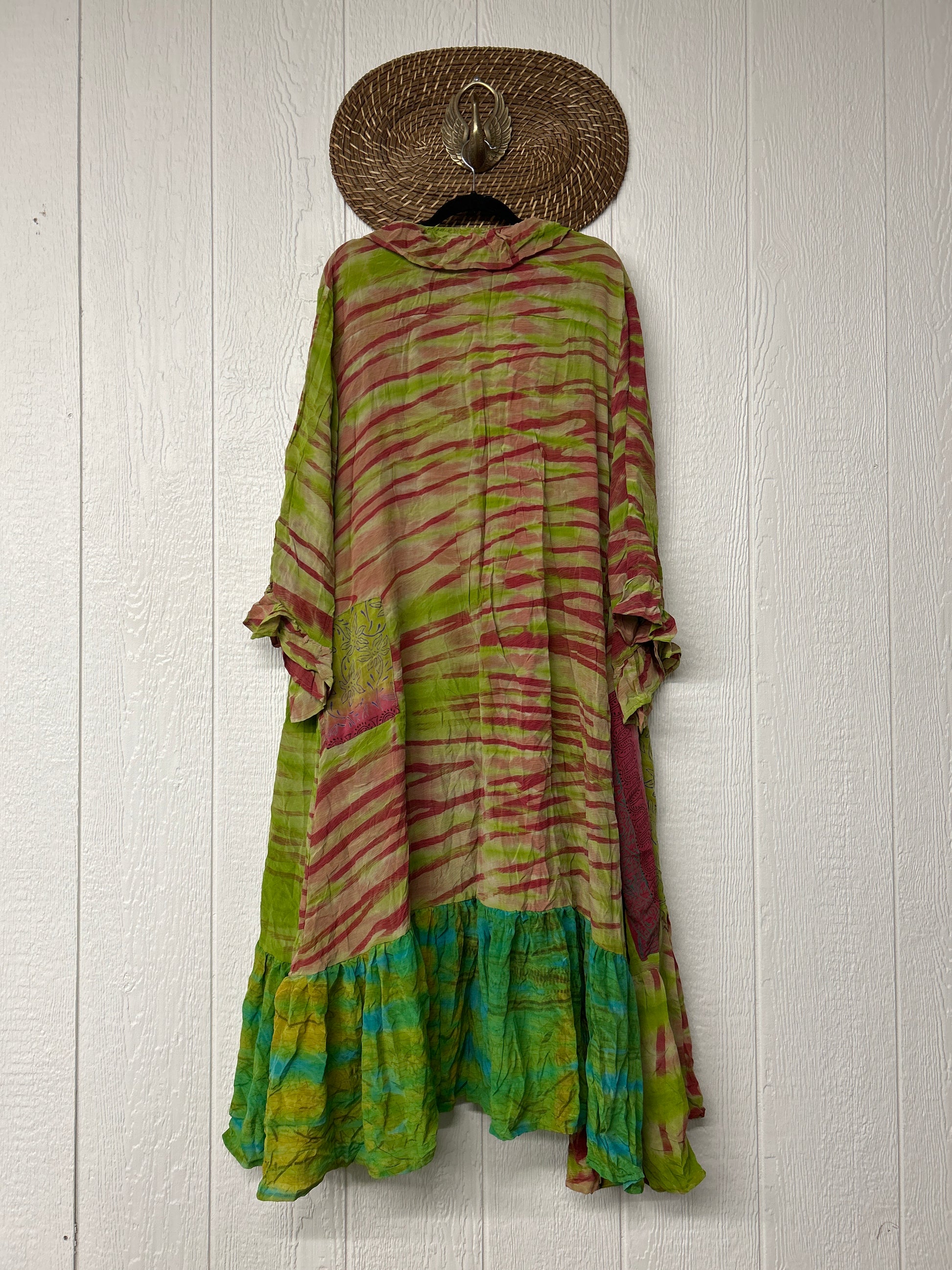 Our pixie duster is pure magic! crafted from ultra lux vintage crepe sari this ethereal layer features ruffles all the way around the outer hem, bell sleeves, double tie closure & high low hem for extra dimension size recommended 00-22/24
