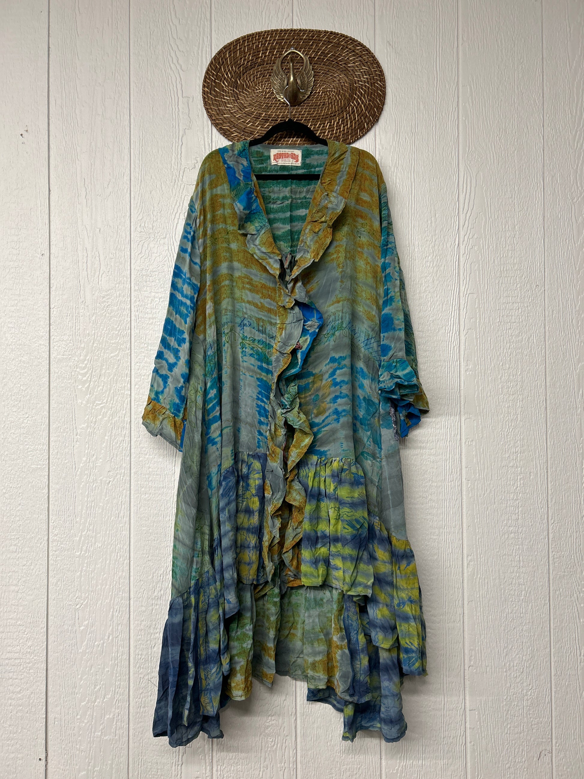 Our pixie duster is pure magic! crafted from ultra lux vintage crepe sari this ethereal layer features ruffles all the way around the outer hem, bell sleeves, double tie closure & high low hem for extra dimension size recommended 00-22/24 Crafted and sewn by families in a small village in Northern India providing work and a fair living. This product should be hand washed and line dried for longest life. For softness, fluff in the dryer on low heat after it has dried from hand washing. Disclosure: Our vintage styles have lived a full life before becoming the designs in our shop. Fabrics may have small threads or holes in the layers. Color inconsistency or small stains may be present. The saris are sewn together and extend the life of each design. Imperfections should be celebrated.