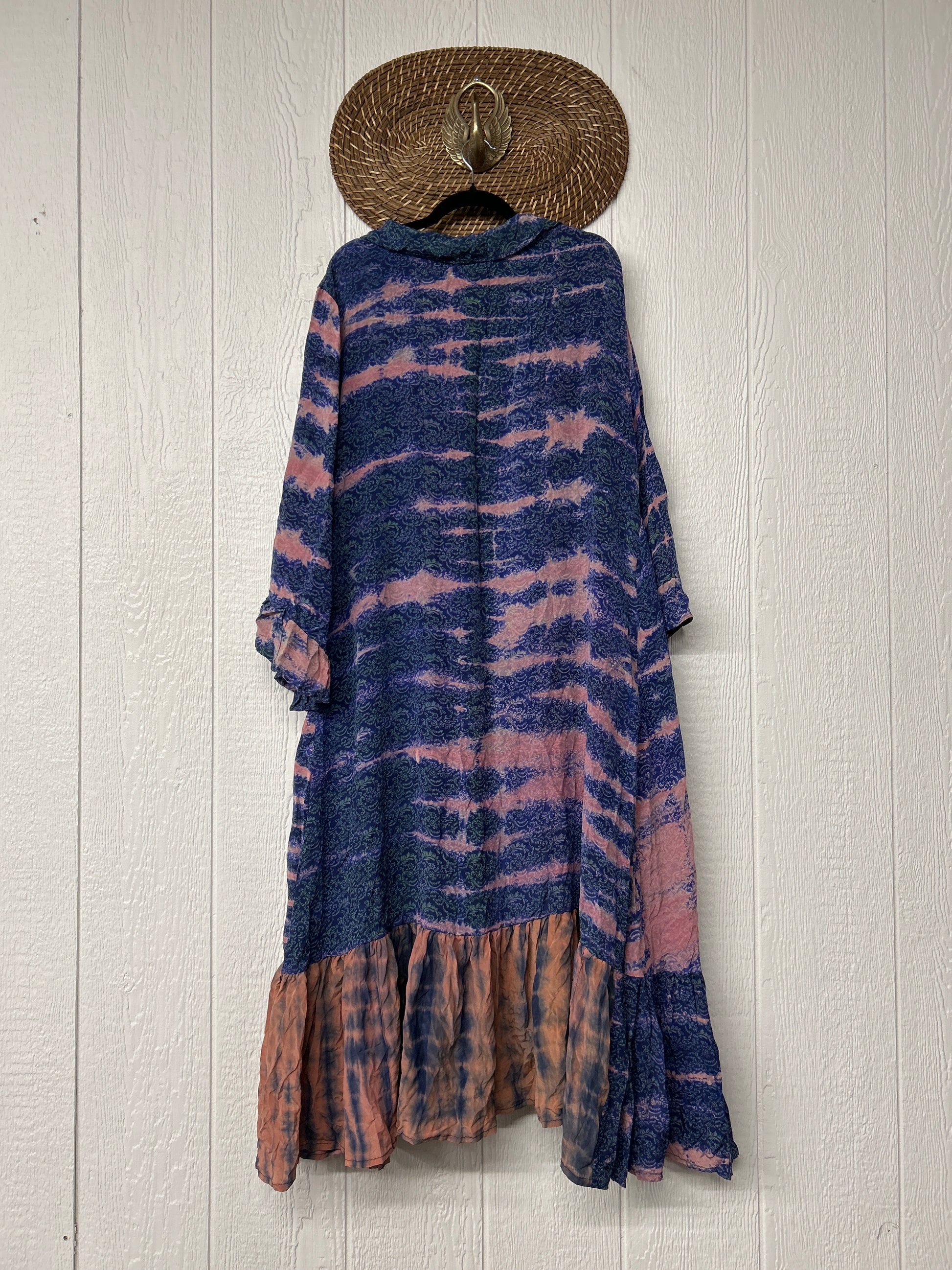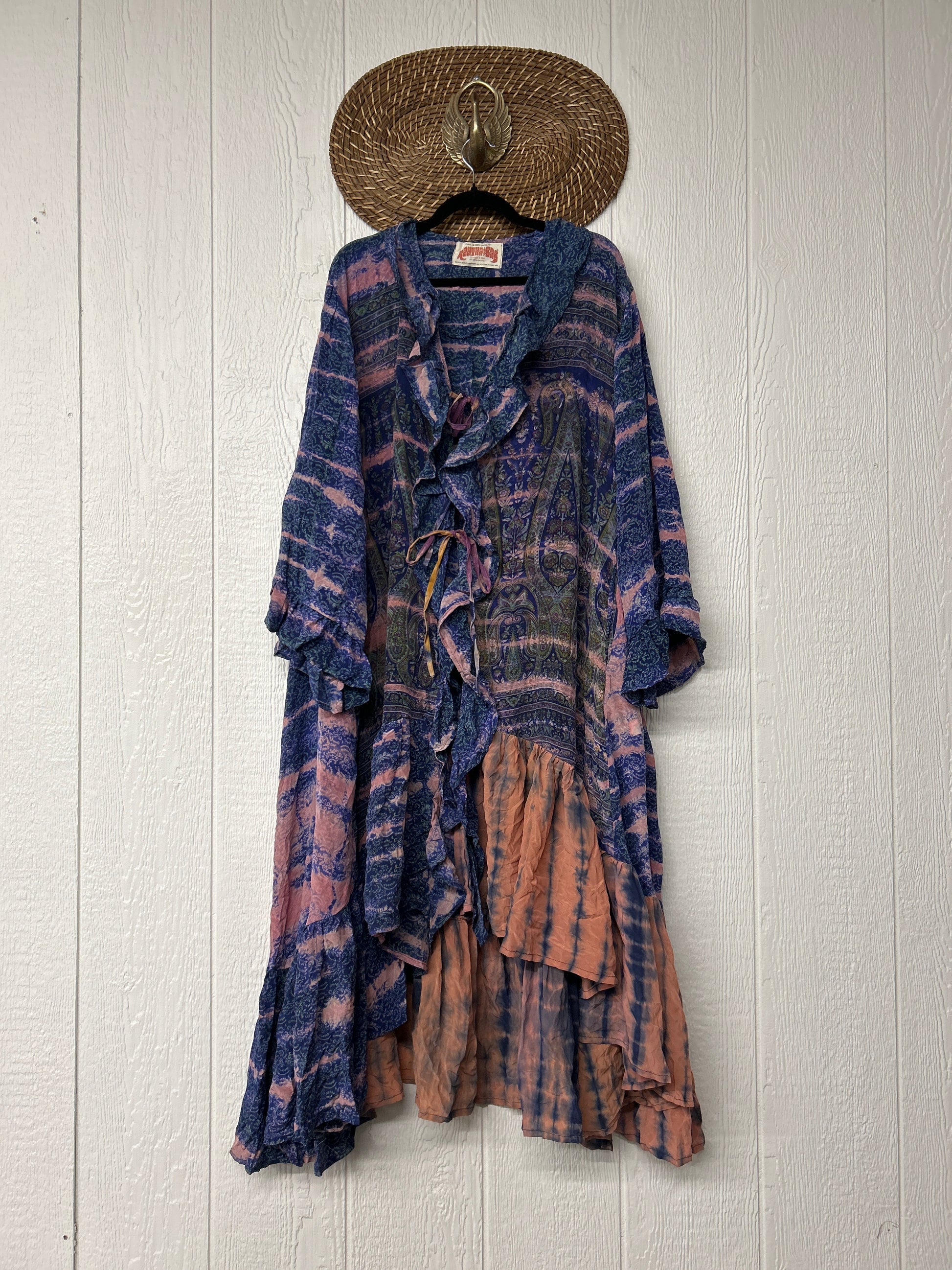 Our pixie duster is pure magic! crafted from ultra lux vintage crepe sari this ethereal layer features ruffles all the way around the outer hem, bell sleeves, double tie closure & high low hem for extra dimension size recommended 00-22/24