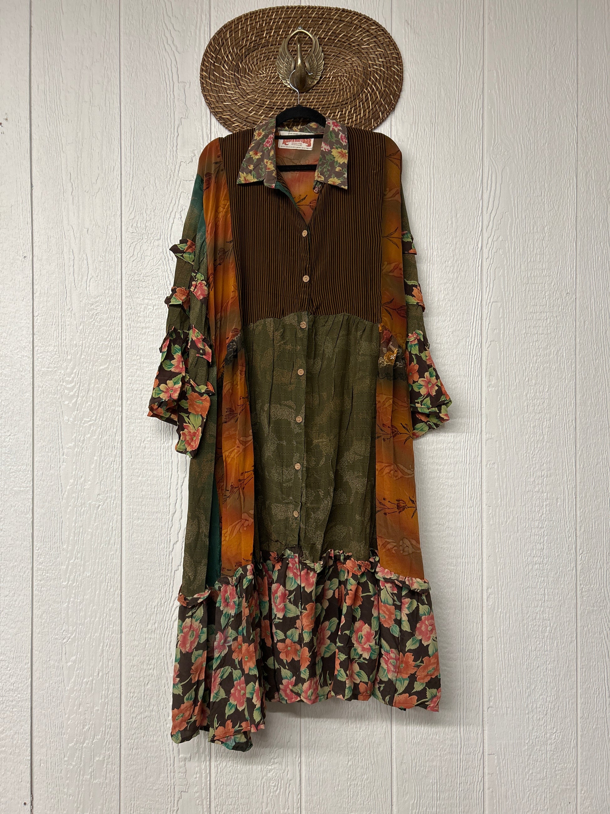 Made from our ultra lux vintage crepe sari this dreamy piece features ruffle bell sleeves, button down front, collar, mixed prints throughout and a fabulous ruffle hem.