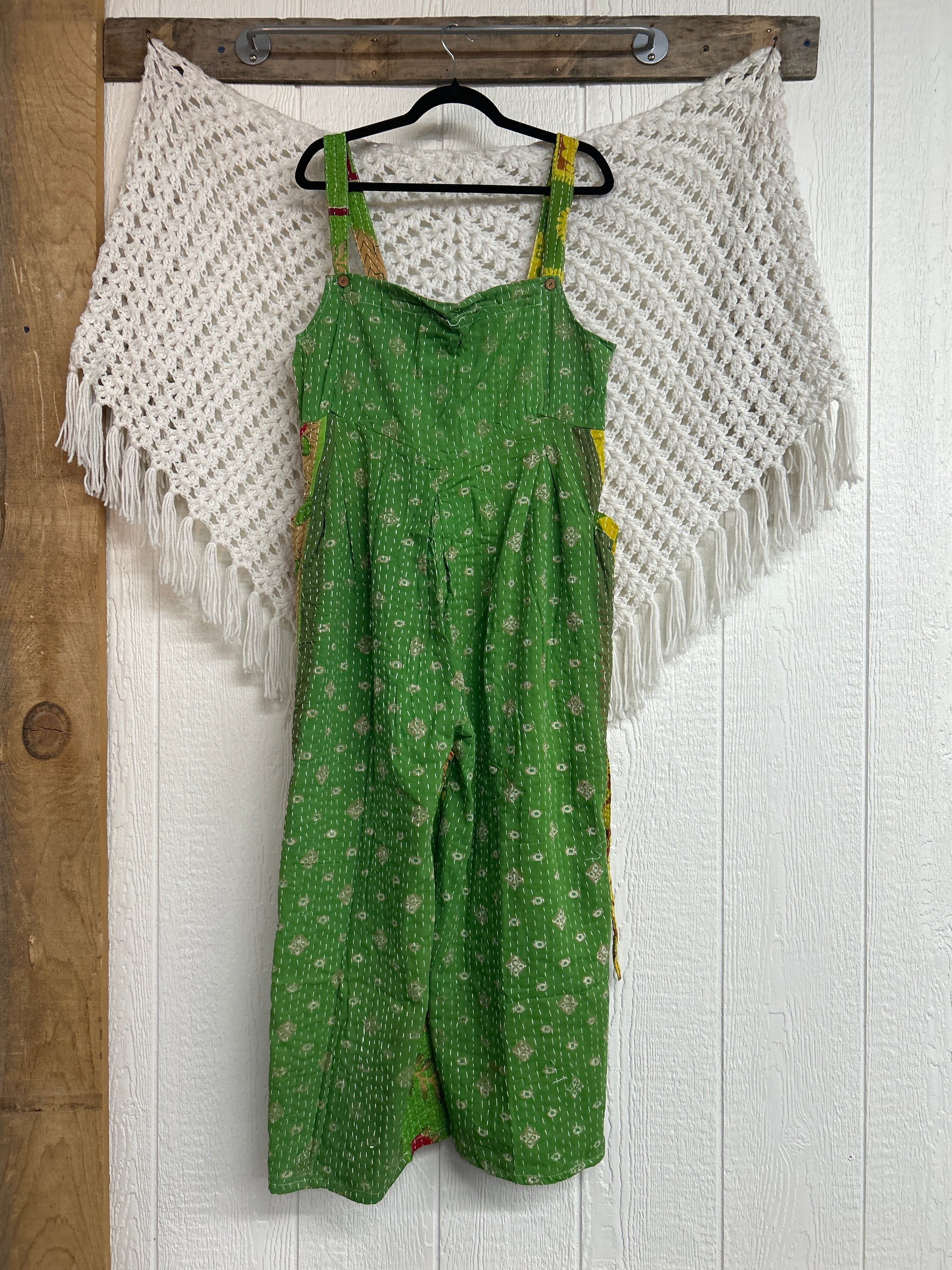 Features adjustable button straps, deep interior pockets, front bib pocket and wide flowy legs