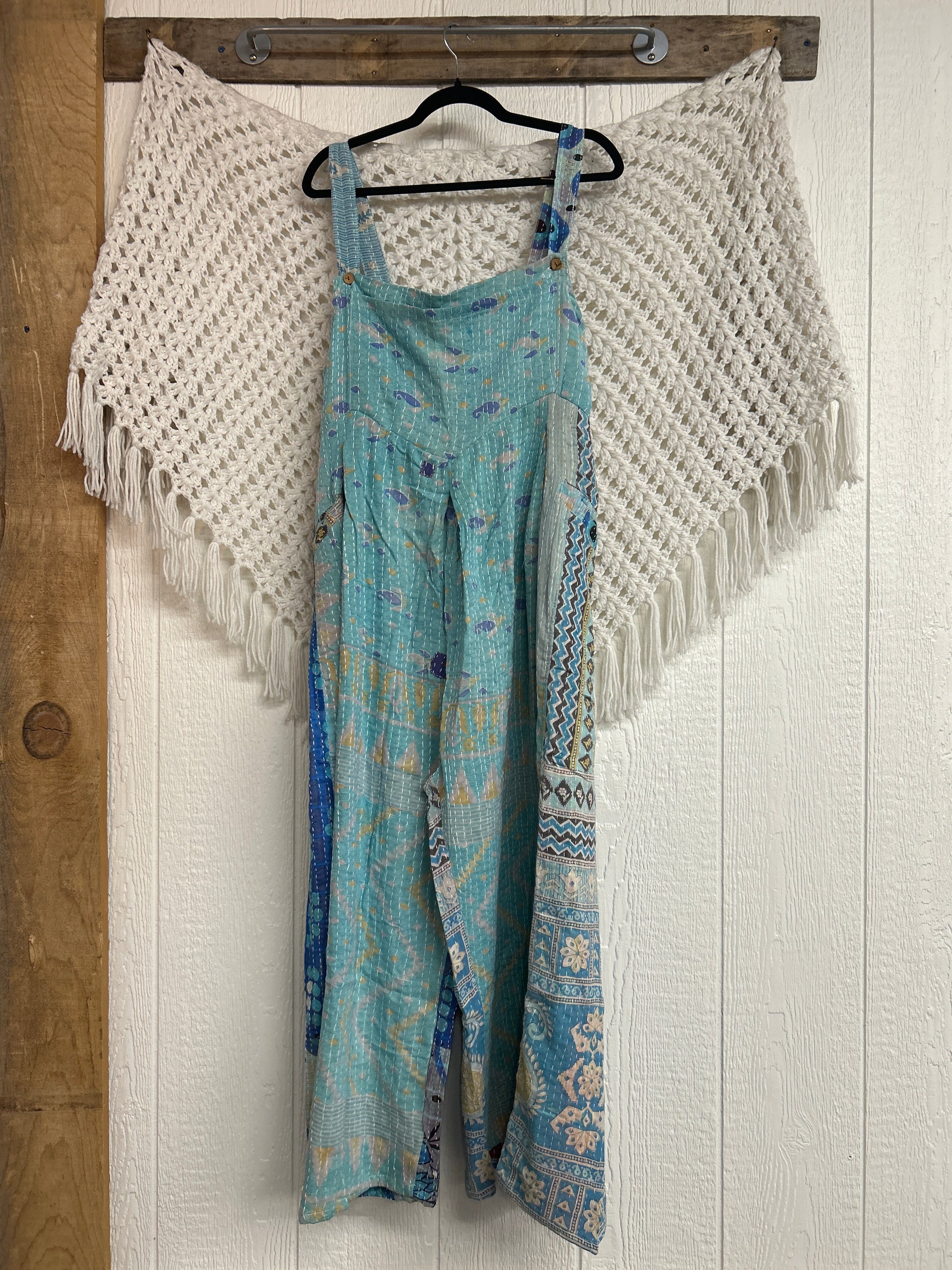 Features adjustable button straps, deep interior pockets, front bib pocket and wide flowy legs