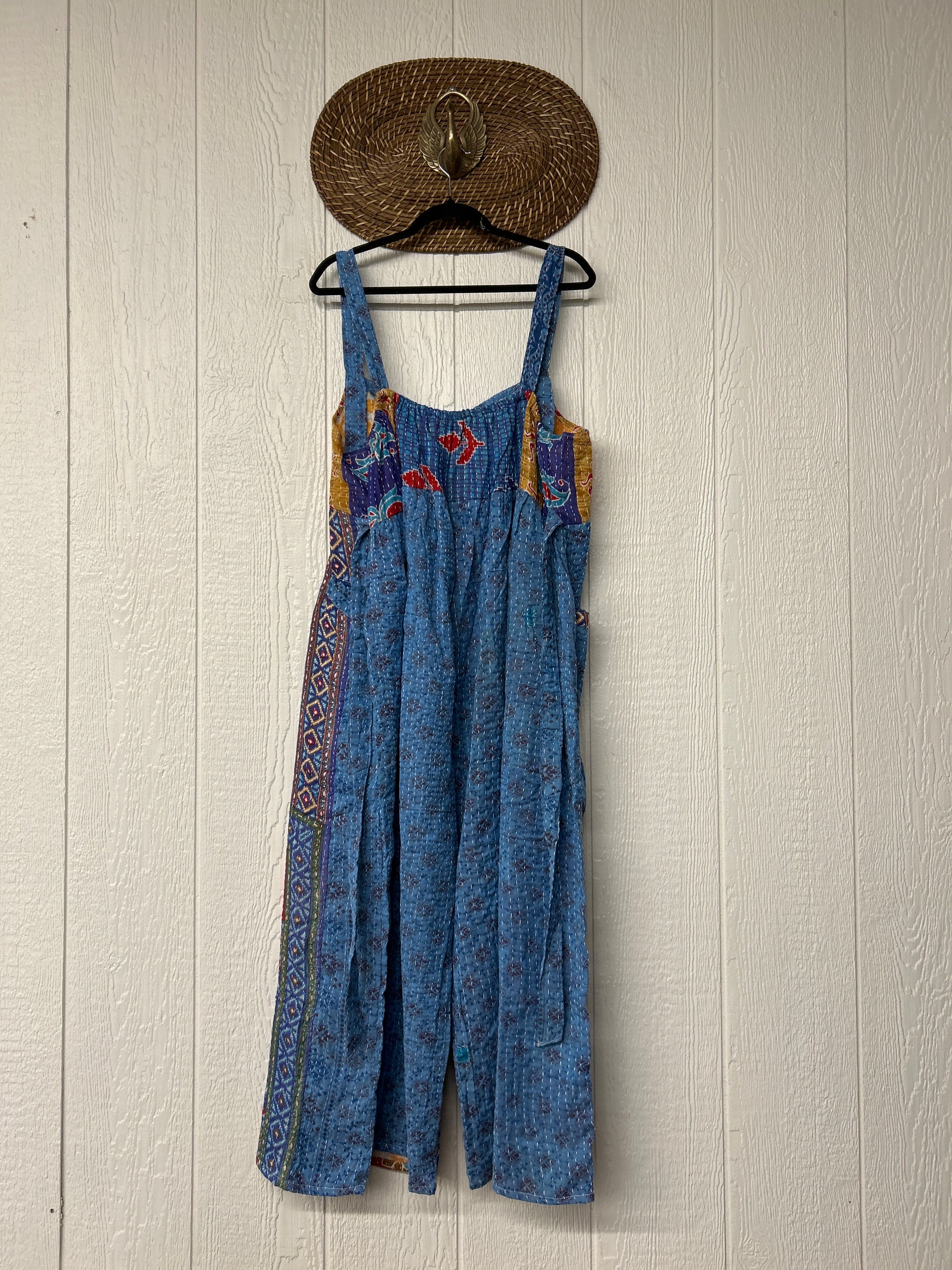 Features adjustable button straps, deep interior pockets, front bib pocket and wide flowy legs