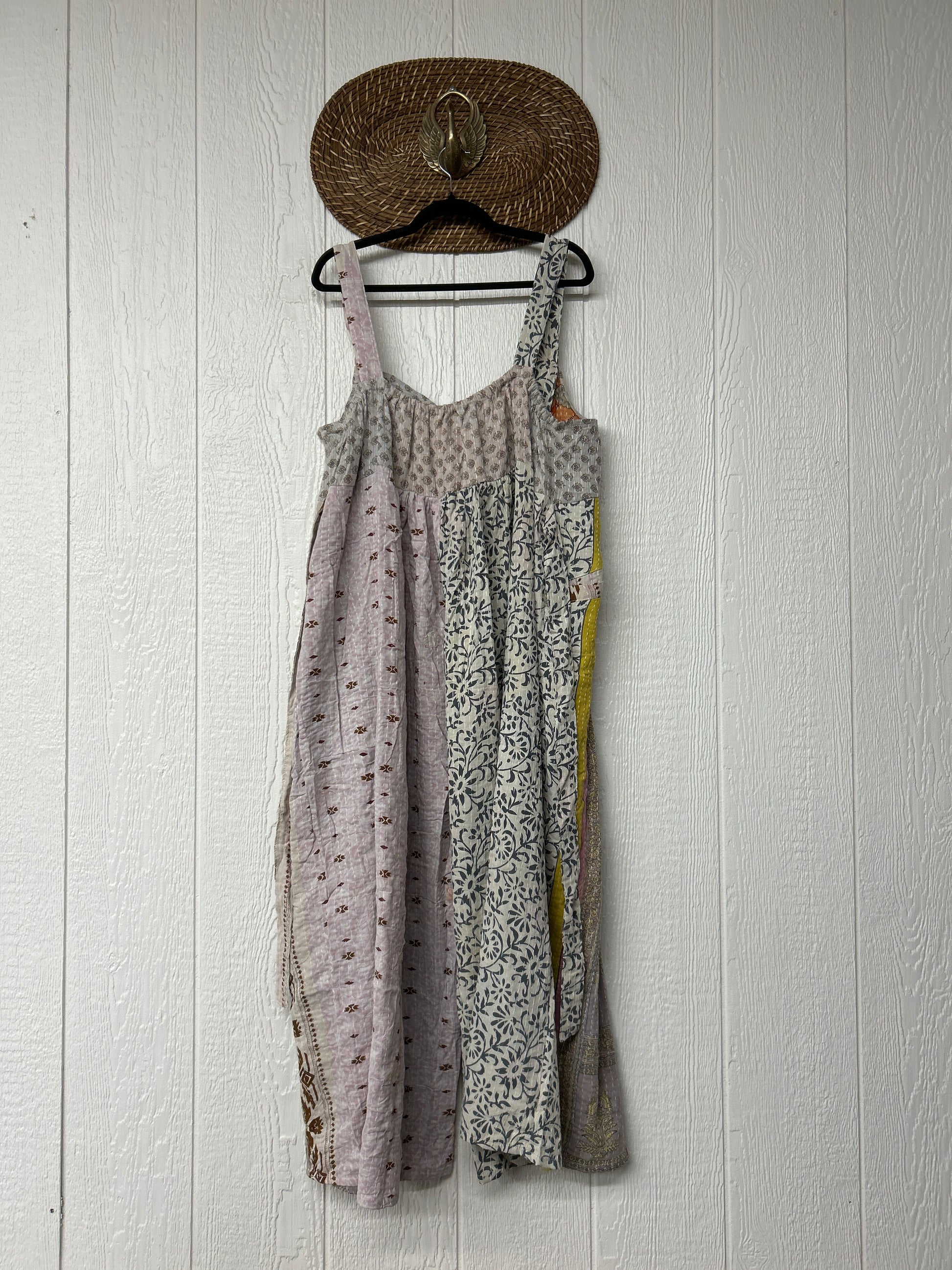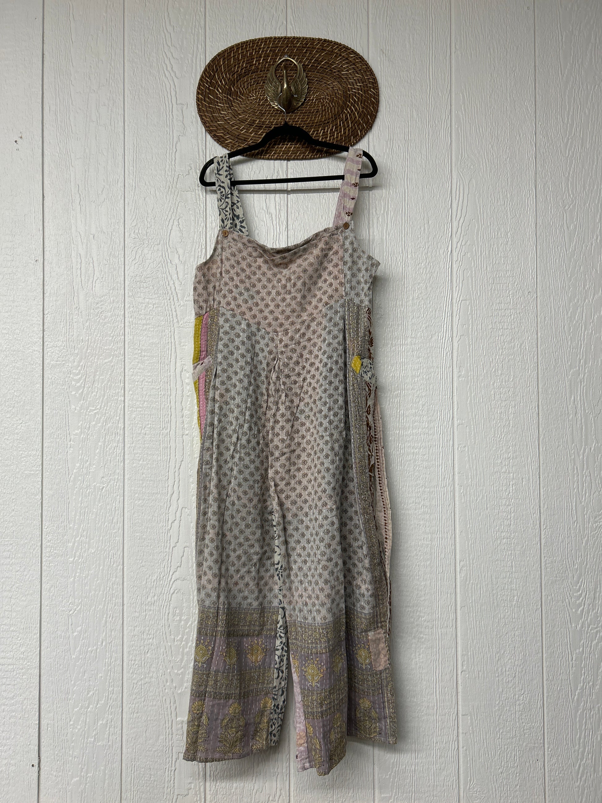 Features adjustable button straps, deep interior pockets, front bib pocket and wide flowy legs