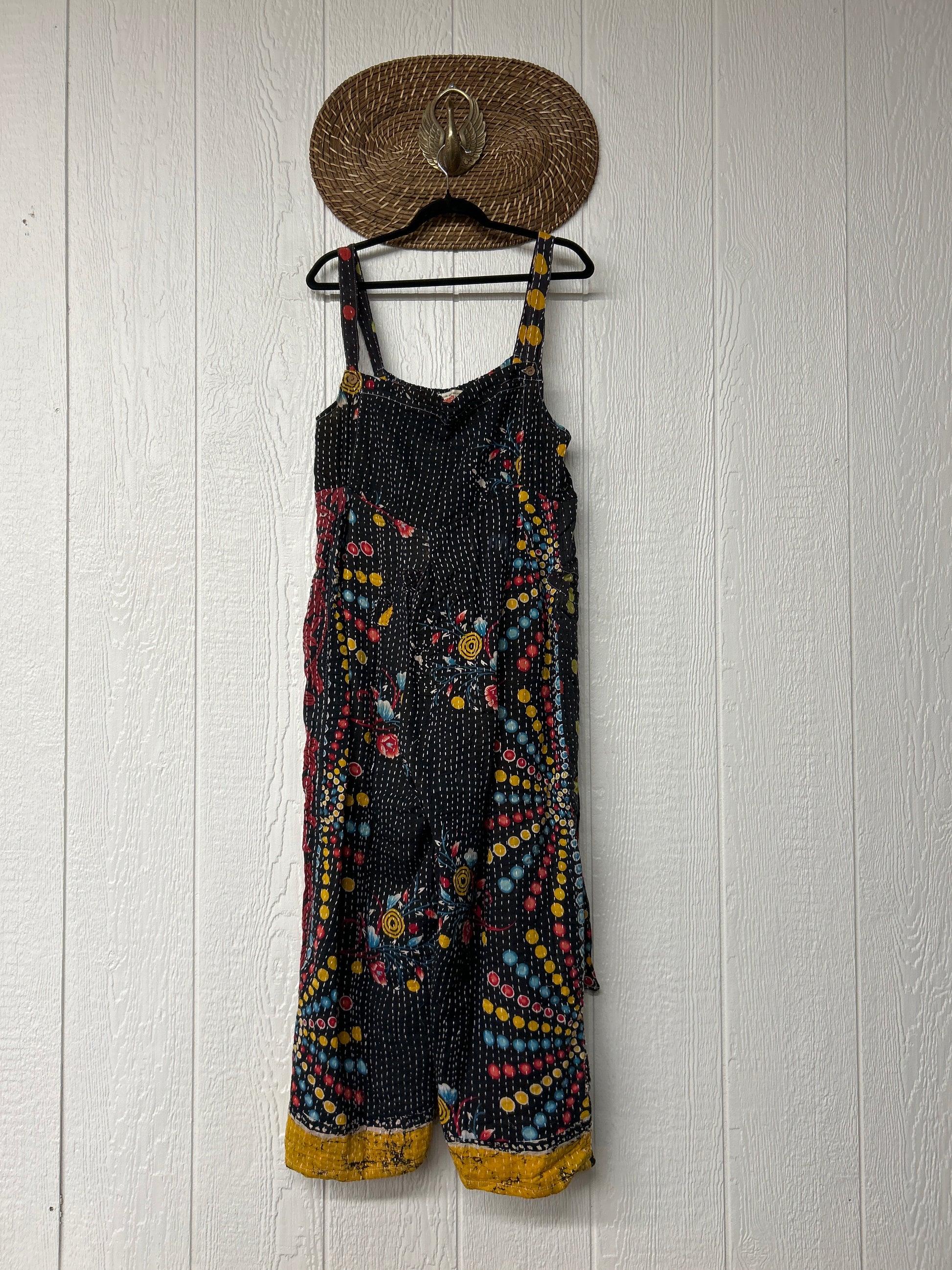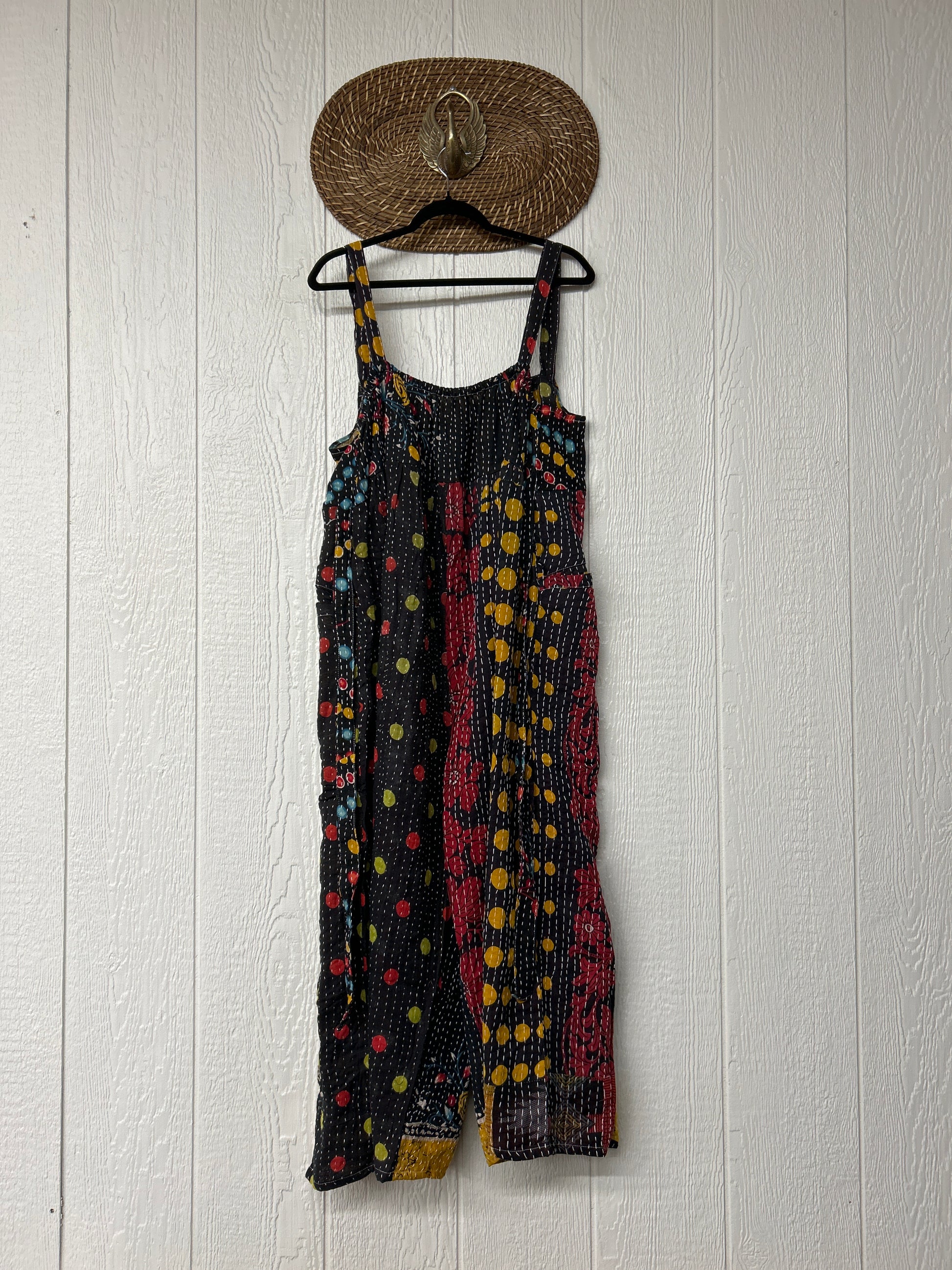 Features adjustable button straps, deep interior pockets, front bib pocket and wide flowy legs