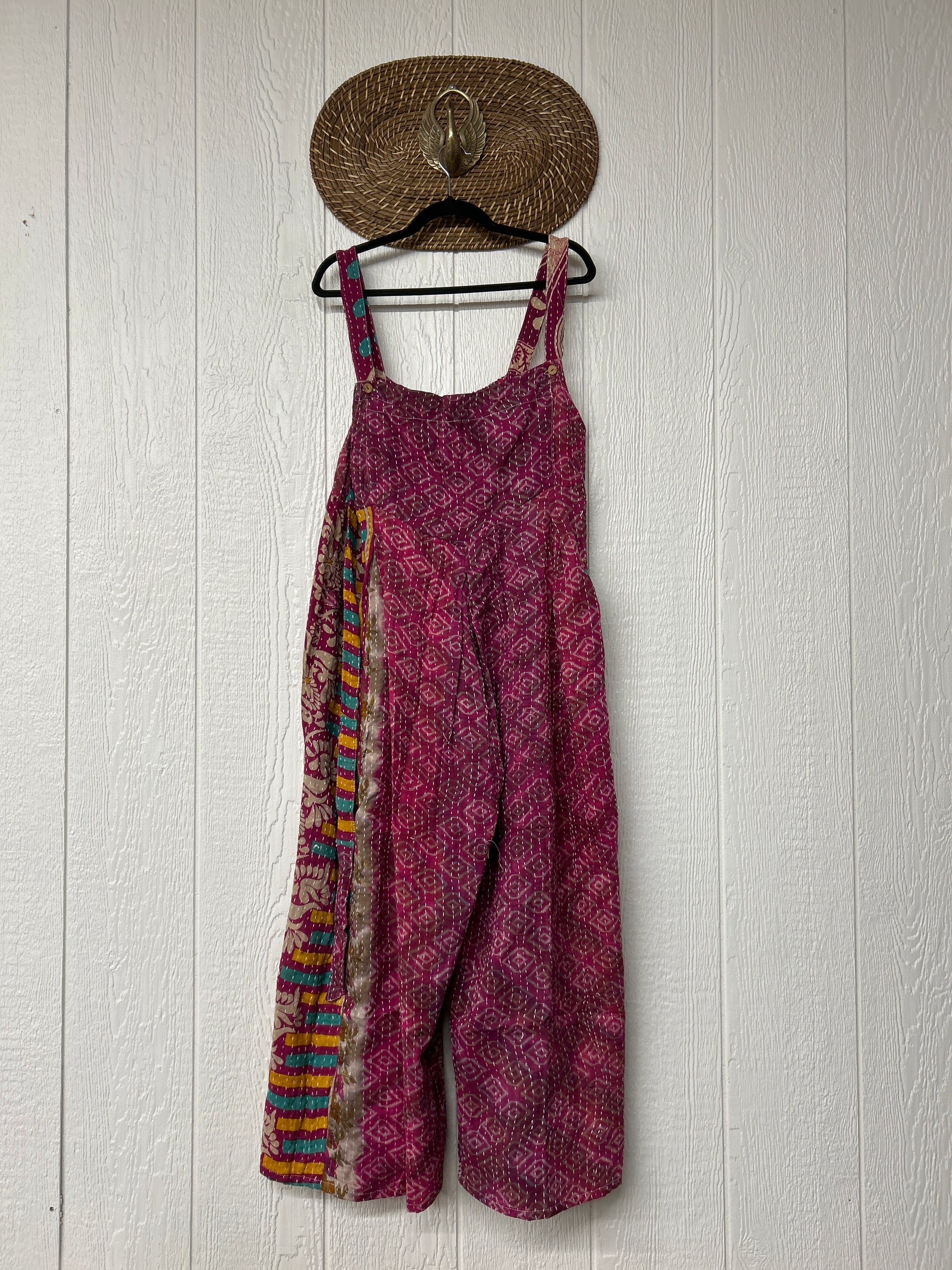 Features adjustable button straps, deep interior pockets, front bib pocket and wide flowy legs