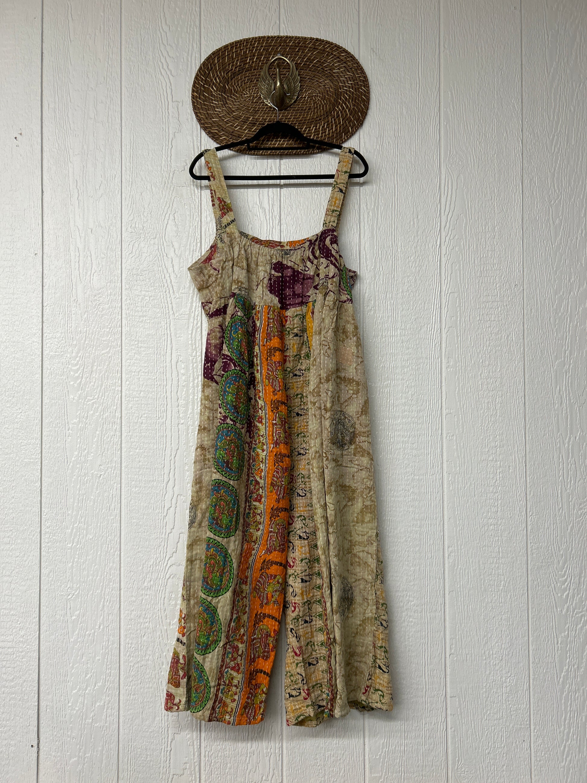 Features adjustable button straps, deep interior pockets, front bib pocket and wide flowy legs