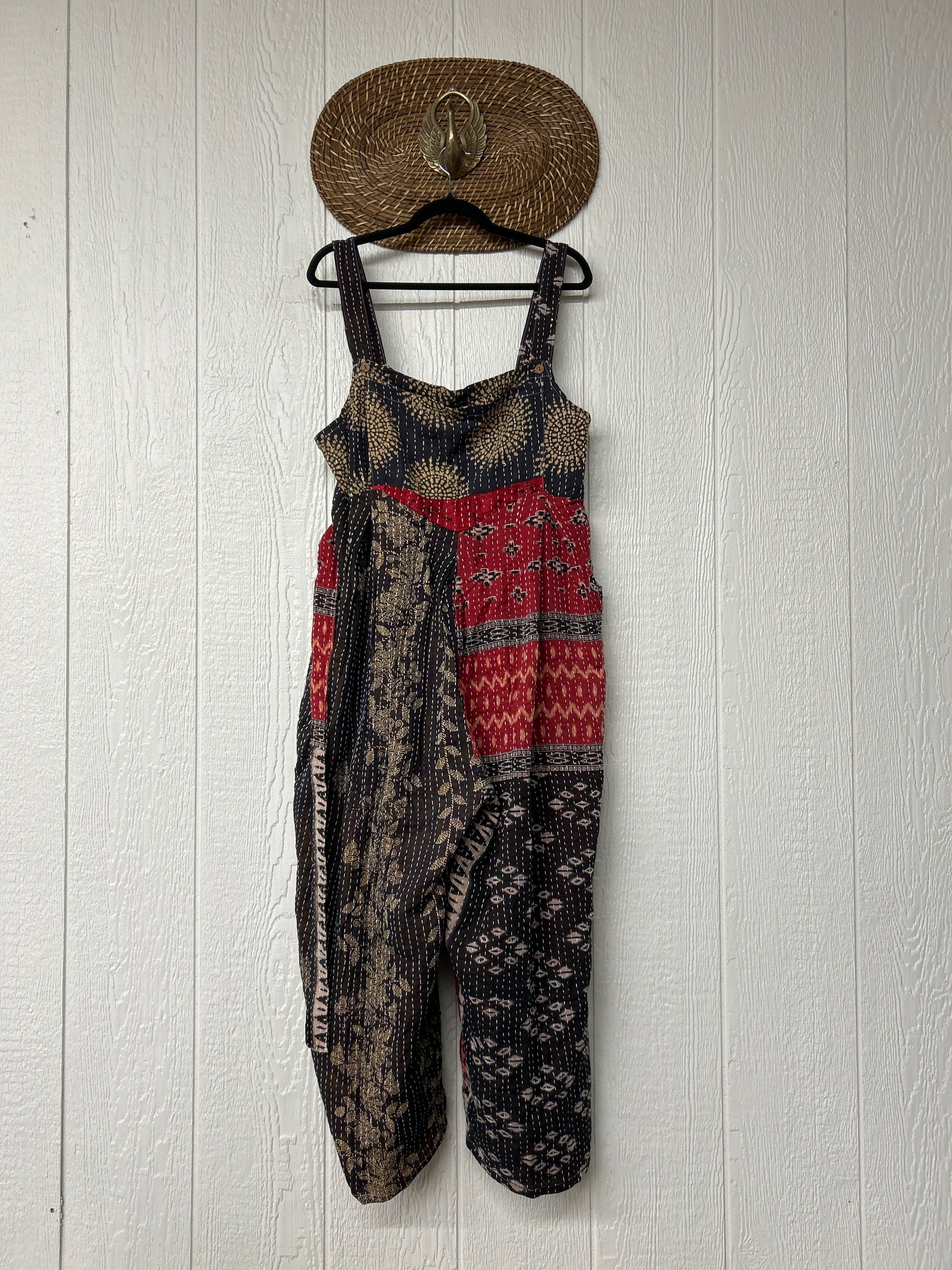 Features adjustable button straps, deep interior pockets, front bib pocket and wide flowy legs