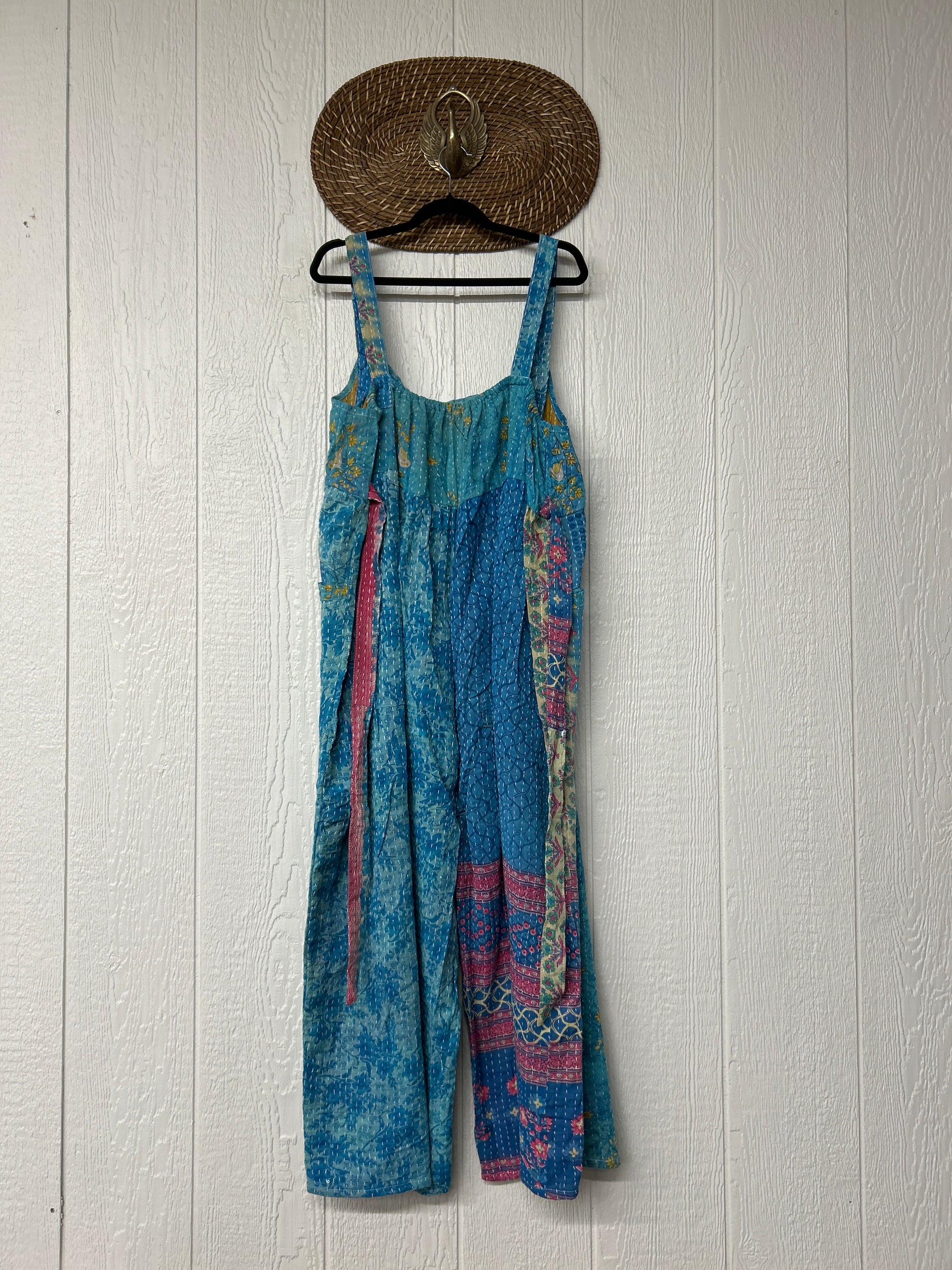 Features adjustable button straps, deep interior pockets, front bib pocket and wide flowy legs
