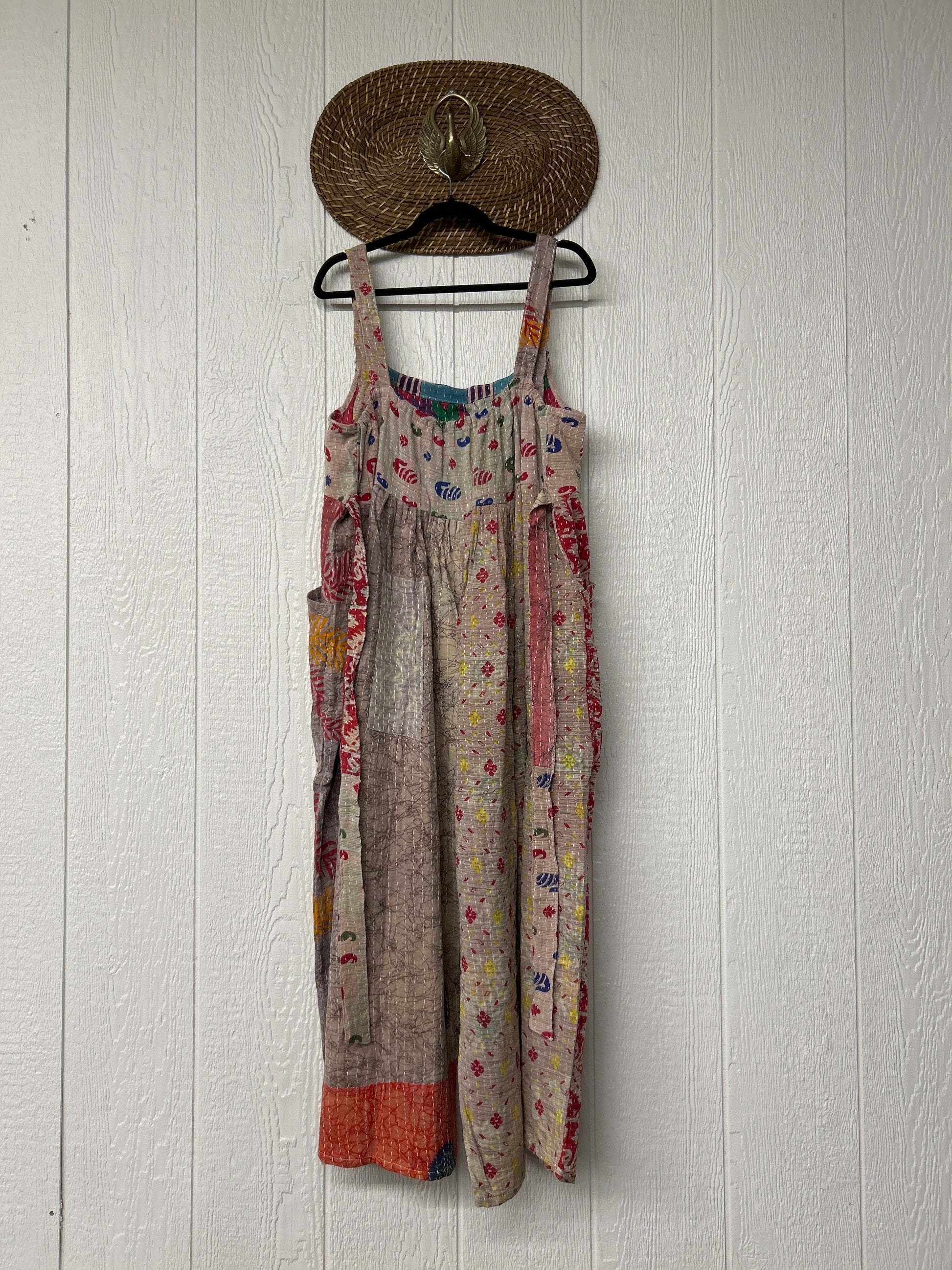 Features adjustable button straps, deep interior pockets, front bib pocket and wide flowy legs