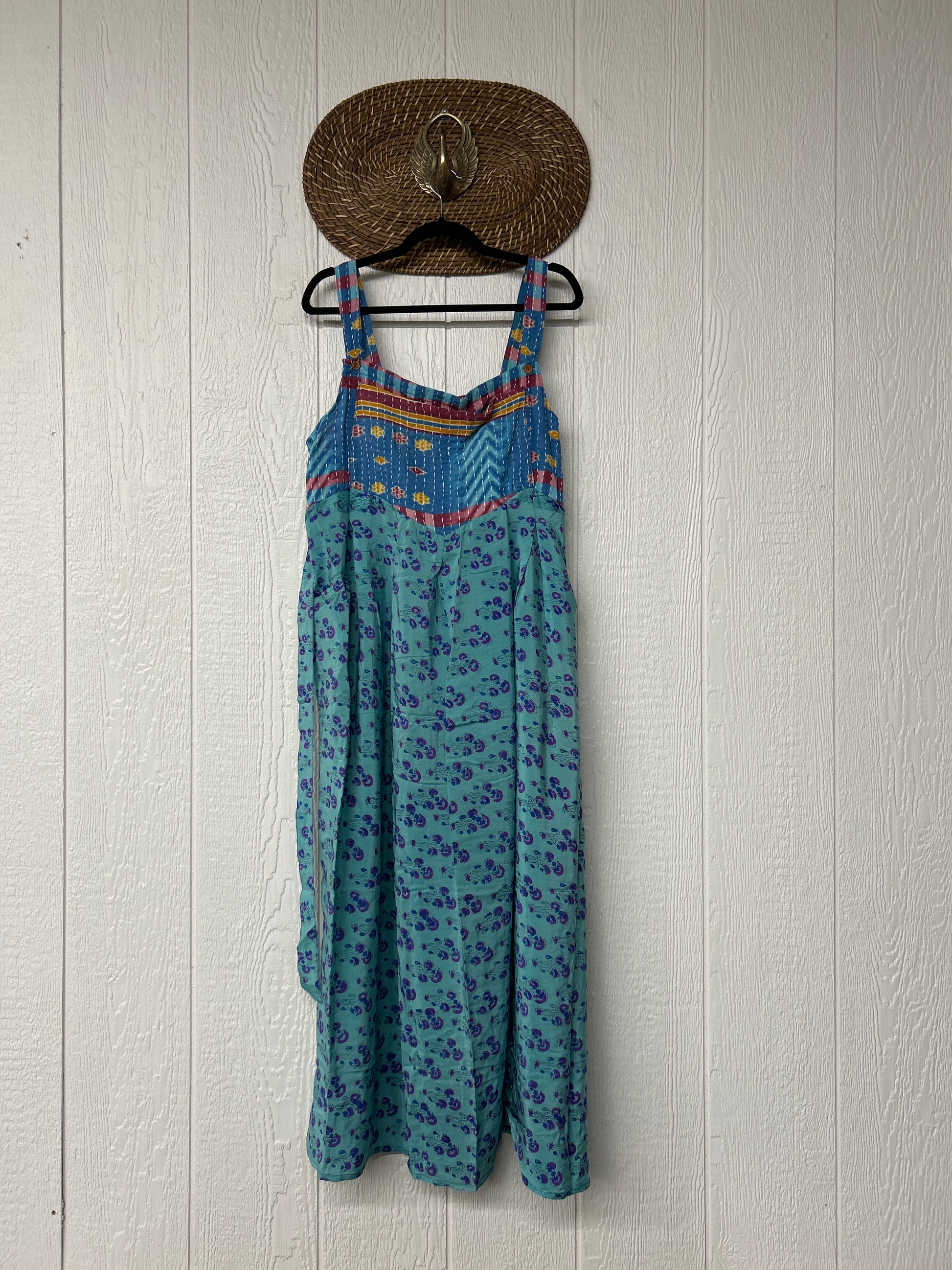 Perfect for EVERY season this overall dress features a kantha bib front with center pocket, adjustable button straps, tie back, crepe skirt and interior pockets on the skirt.