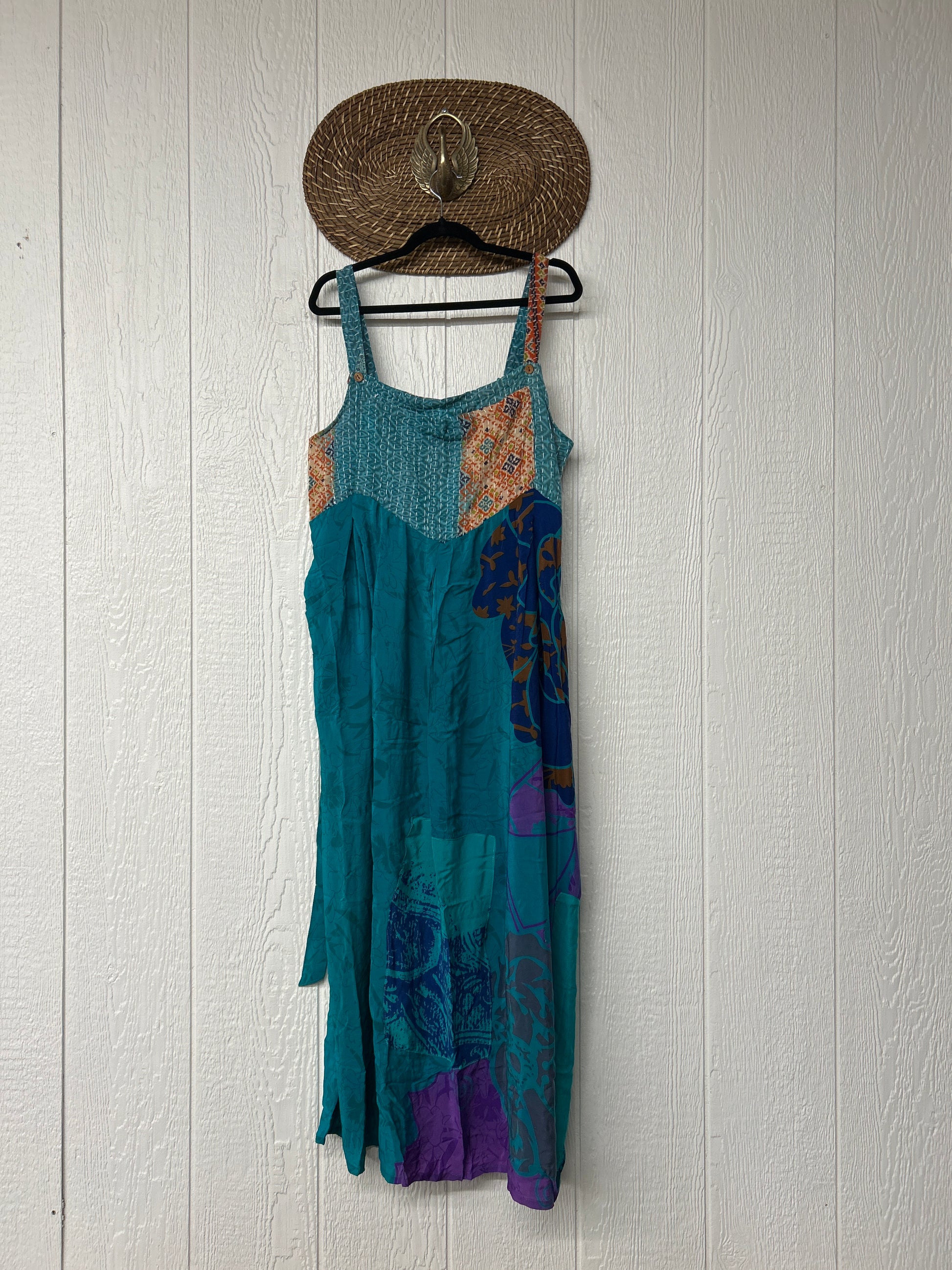 Perfect for EVERY season this overall dress features a kantha bib front with center pocket, adjustable button straps, tie back, crepe skirt and interior pockets on the skirt.