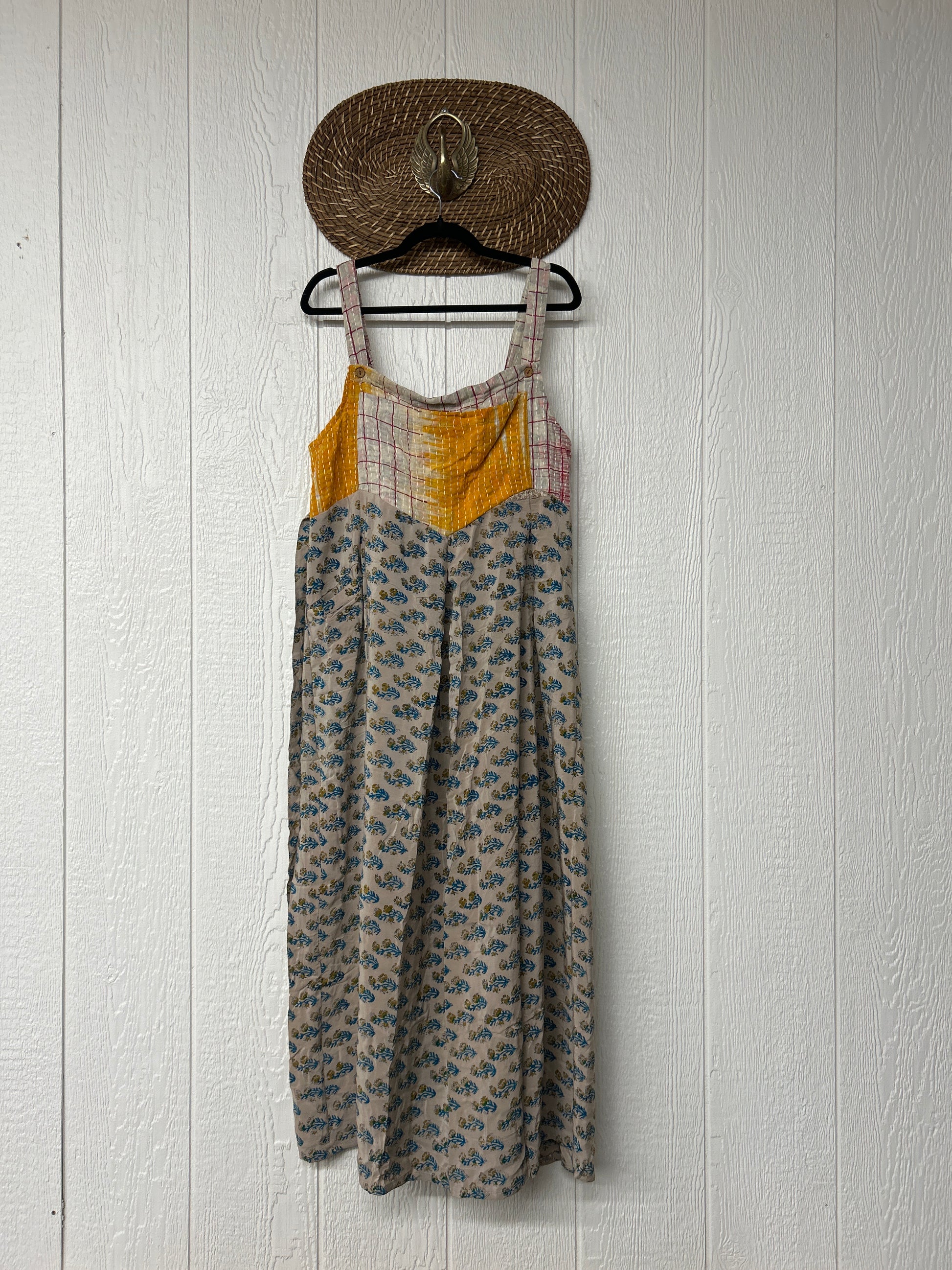 Perfect for EVERY season this overall dress features a kantha bib front with center pocket, adjustable button straps, tie back, crepe skirt and interior pockets on the skirt.