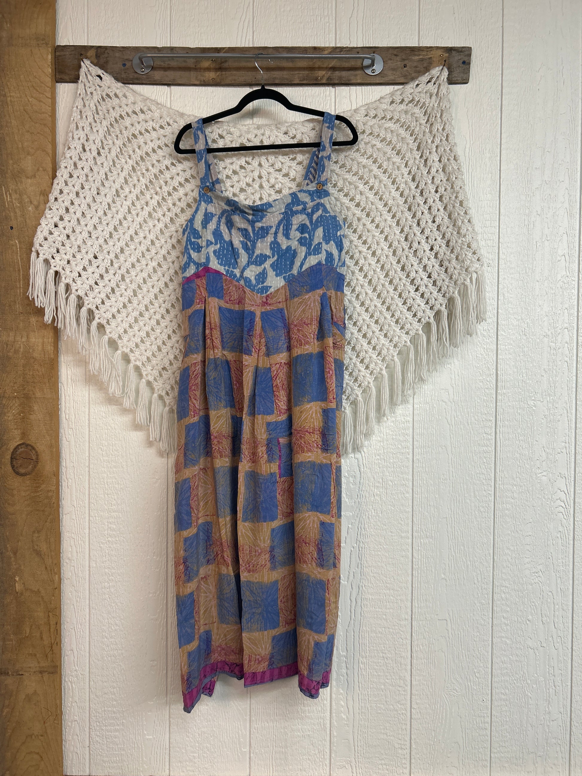 Perfect for EVERY season this overall dress features a kantha bib front with center pocket, adjustable button straps, tie back, crepe skirt and interior pockets on the skirt.