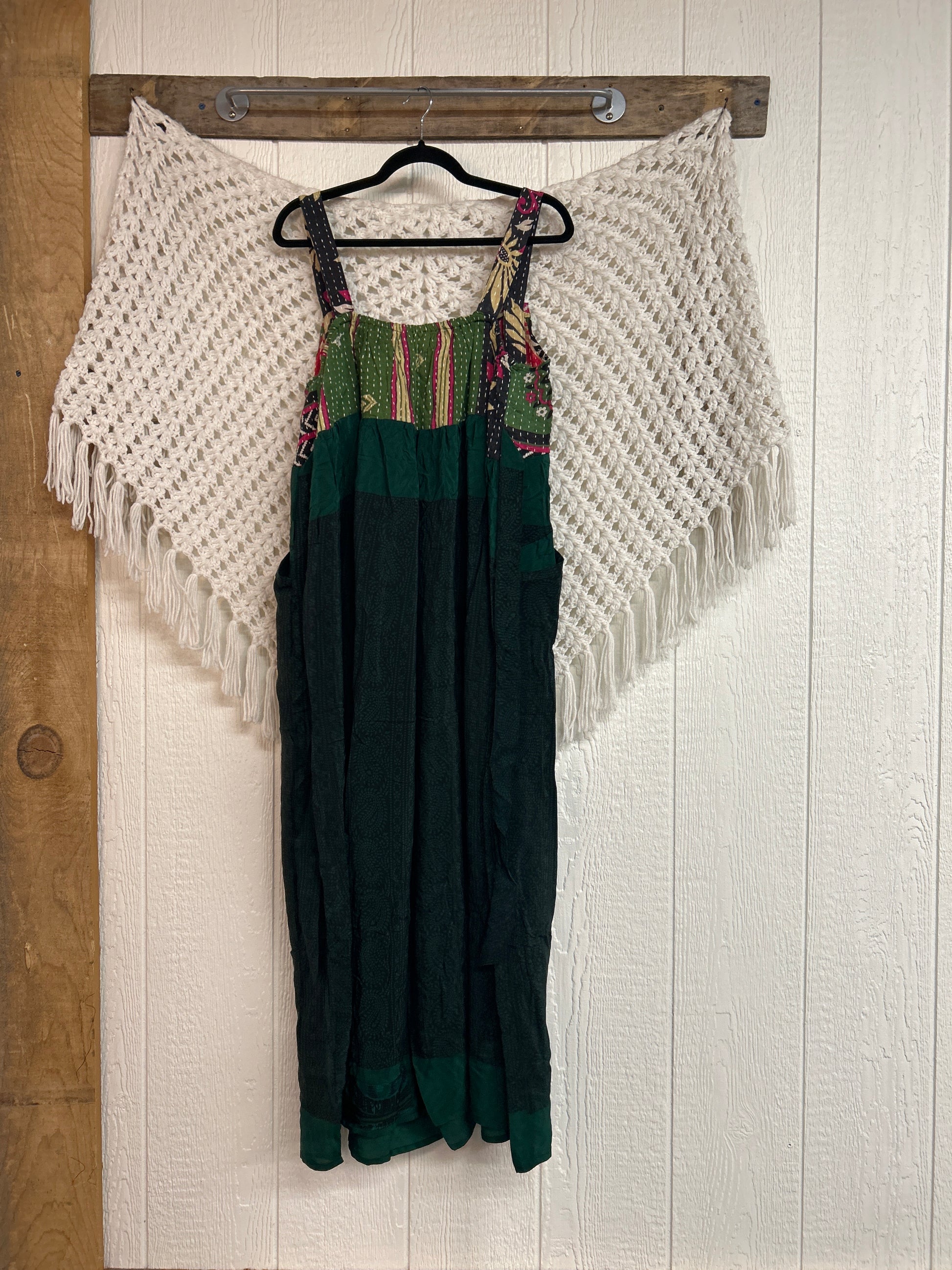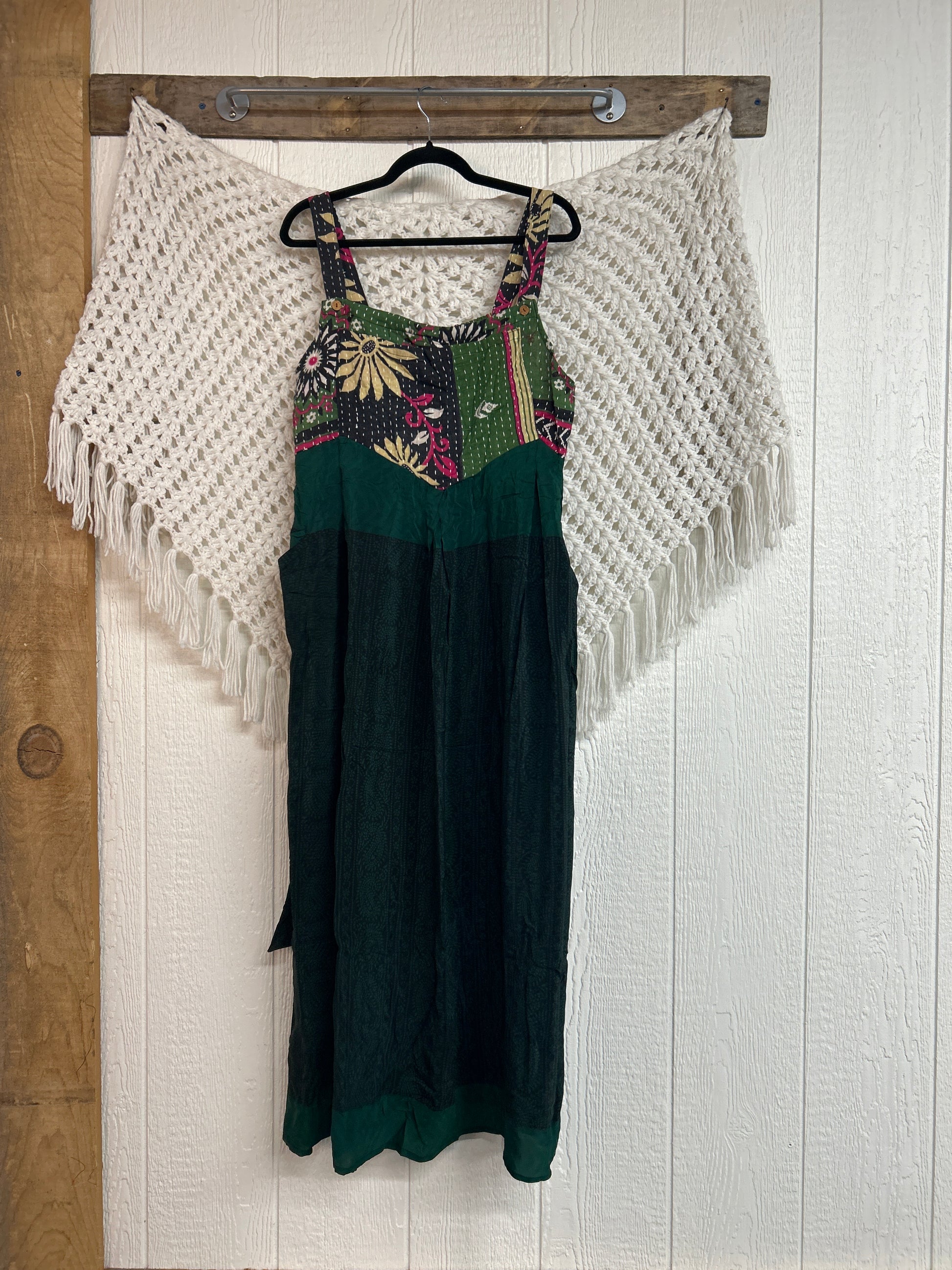 Perfect for EVERY season this overall dress features a kantha bib front with center pocket, adjustable button straps, tie back, crepe skirt and interior pockets on the skirt.