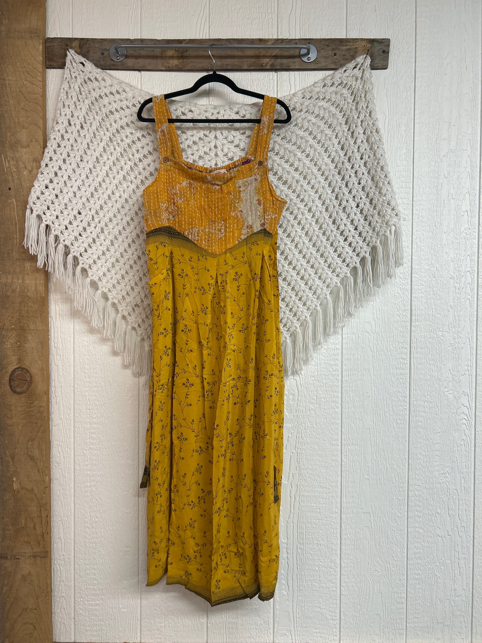 Perfect for EVERY season this overall dress features a kantha bib front with center pocket, adjustable button straps, tie back, crepe skirt and interior pockets on the skirt.