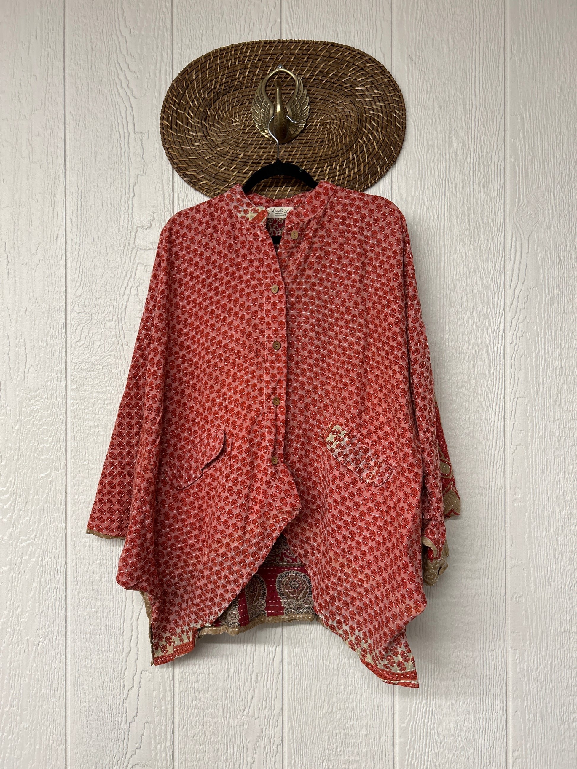 that features coconut buttons down the front and on the cuff, dropped shoulders with long sleeves and deep pockets.