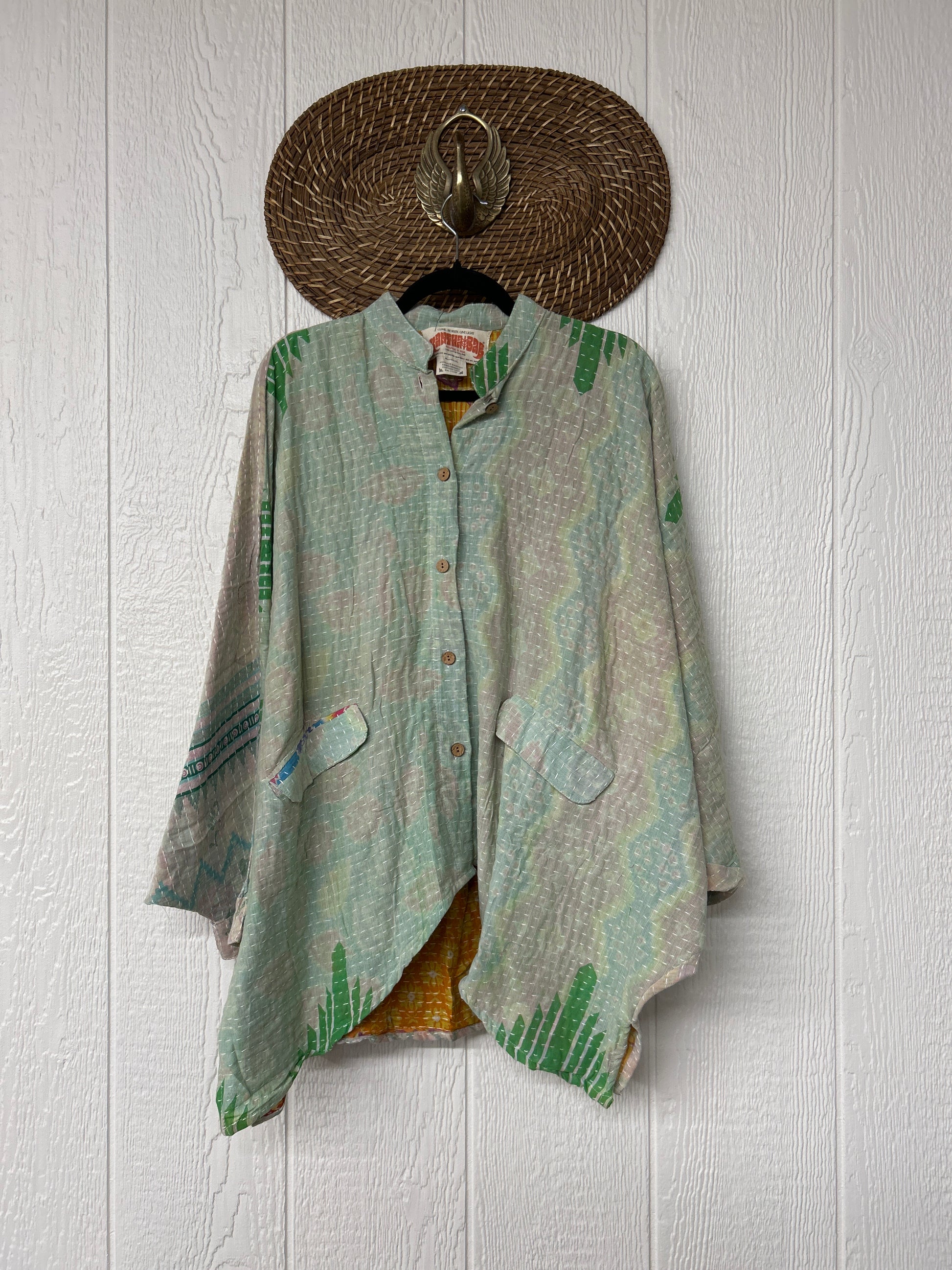 that features coconut buttons down the front and on the cuff, dropped shoulders with long sleeves and deep pockets.