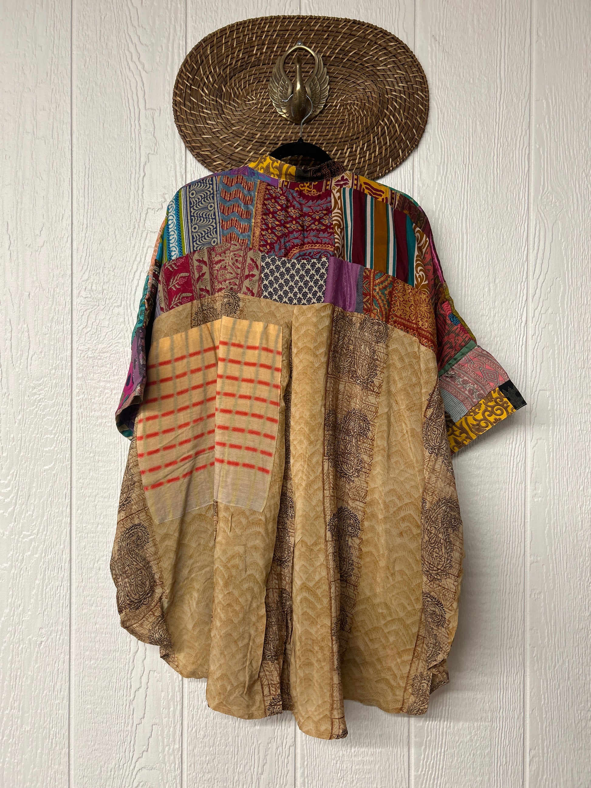 Made from hand-stitched patchwork vintage crepe sari, this billowy dream is fully lined in the front with cotton sari. Features a crepe panel in the back, functional buttons, two slouchy pockets in the front, and a curved bottom.