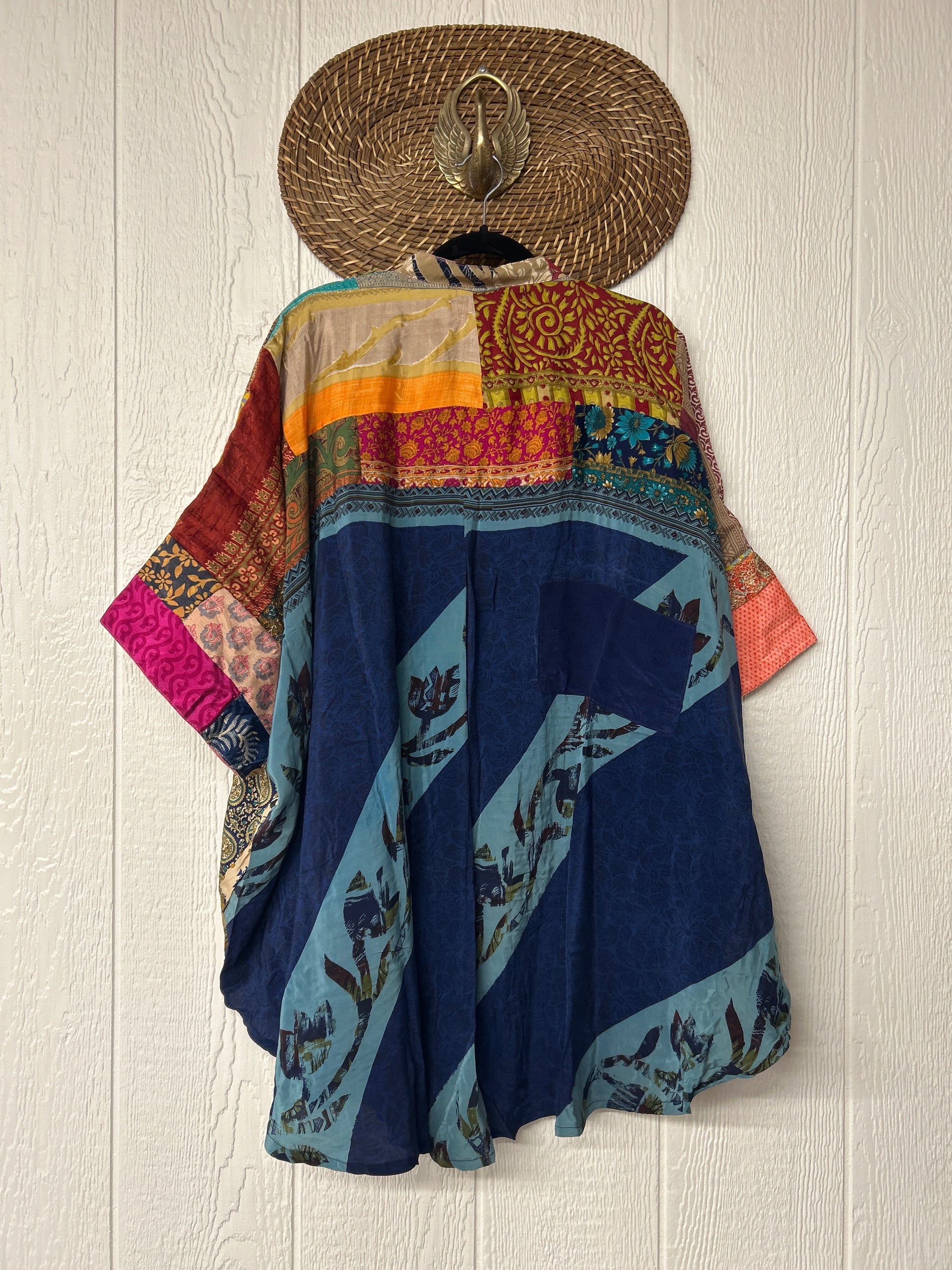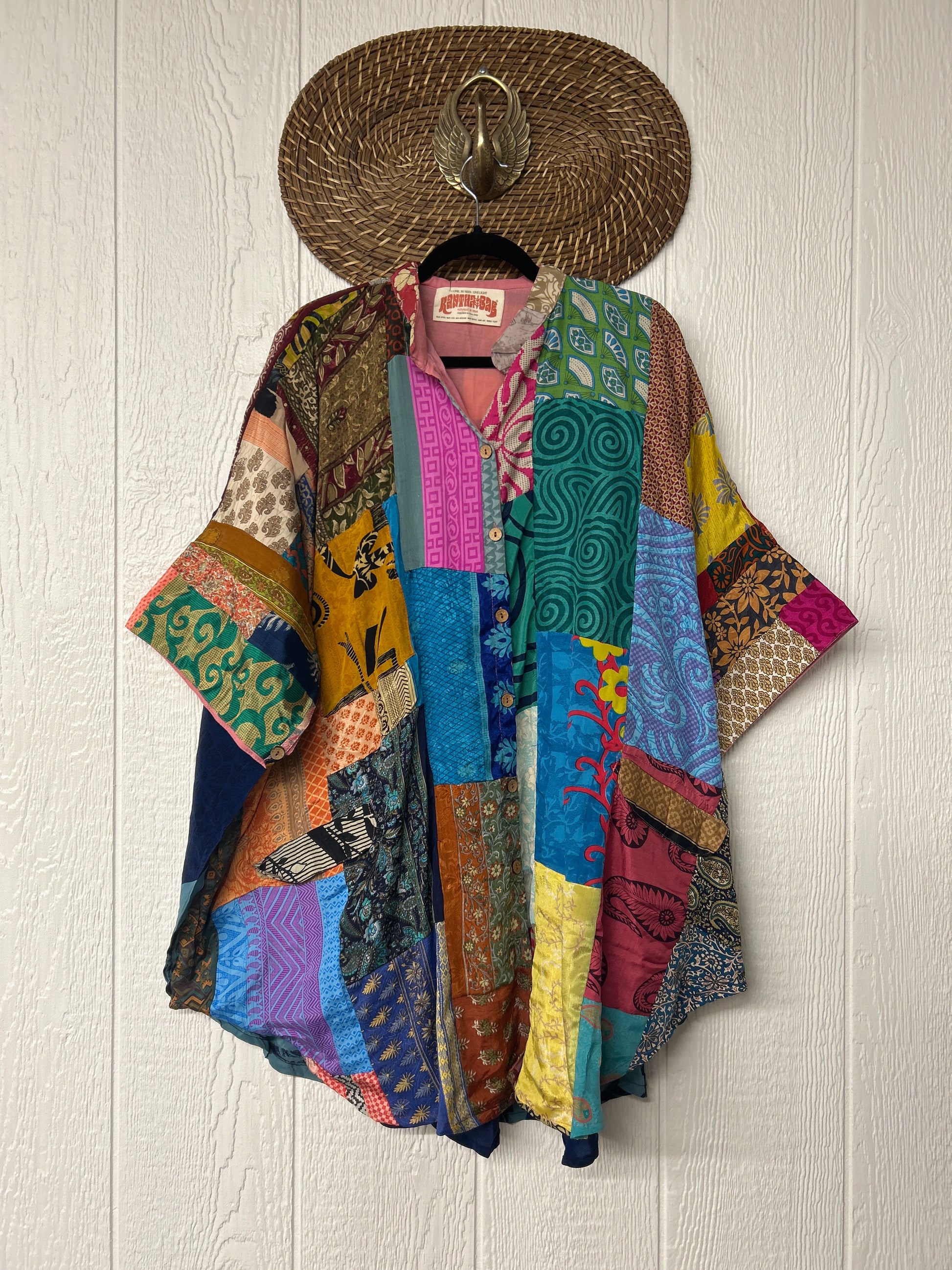 Made from hand-stitched patchwork vintage crepe sari, this billowy dream is fully lined in the front with cotton sari. Features a crepe panel in the back, functional buttons, two slouchy pockets in the front, and a curved bottom.