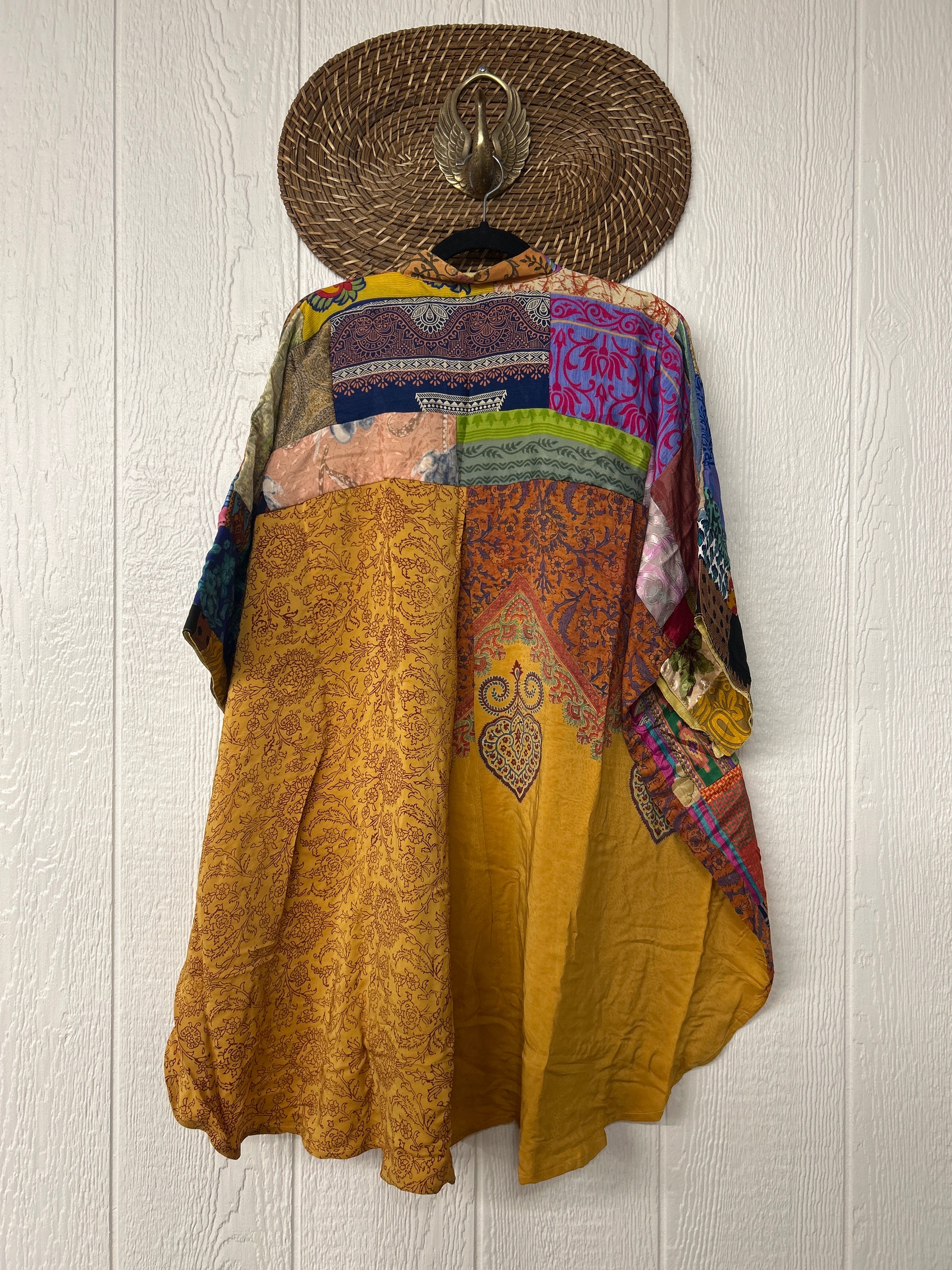 Made from hand-stitched patchwork vintage crepe sari, this billowy dream is fully lined in the front with cotton sari. Features a crepe panel in the back, functional buttons, two slouchy pockets in the front, and a curved bottom.