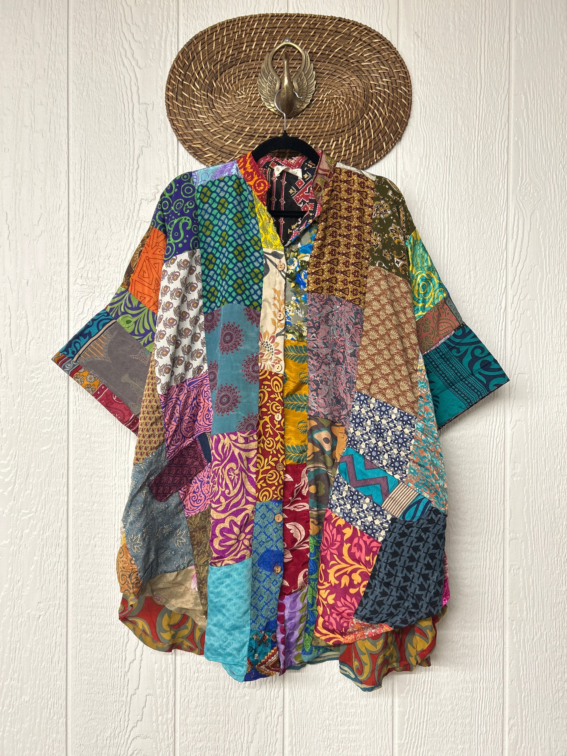 Made from hand-stitched patchwork vintage crepe sari, this billowy dream is fully lined in the front with cotton sari. Features a crepe panel in the back, functional buttons, two slouchy pockets in the front, and a curved bottom.