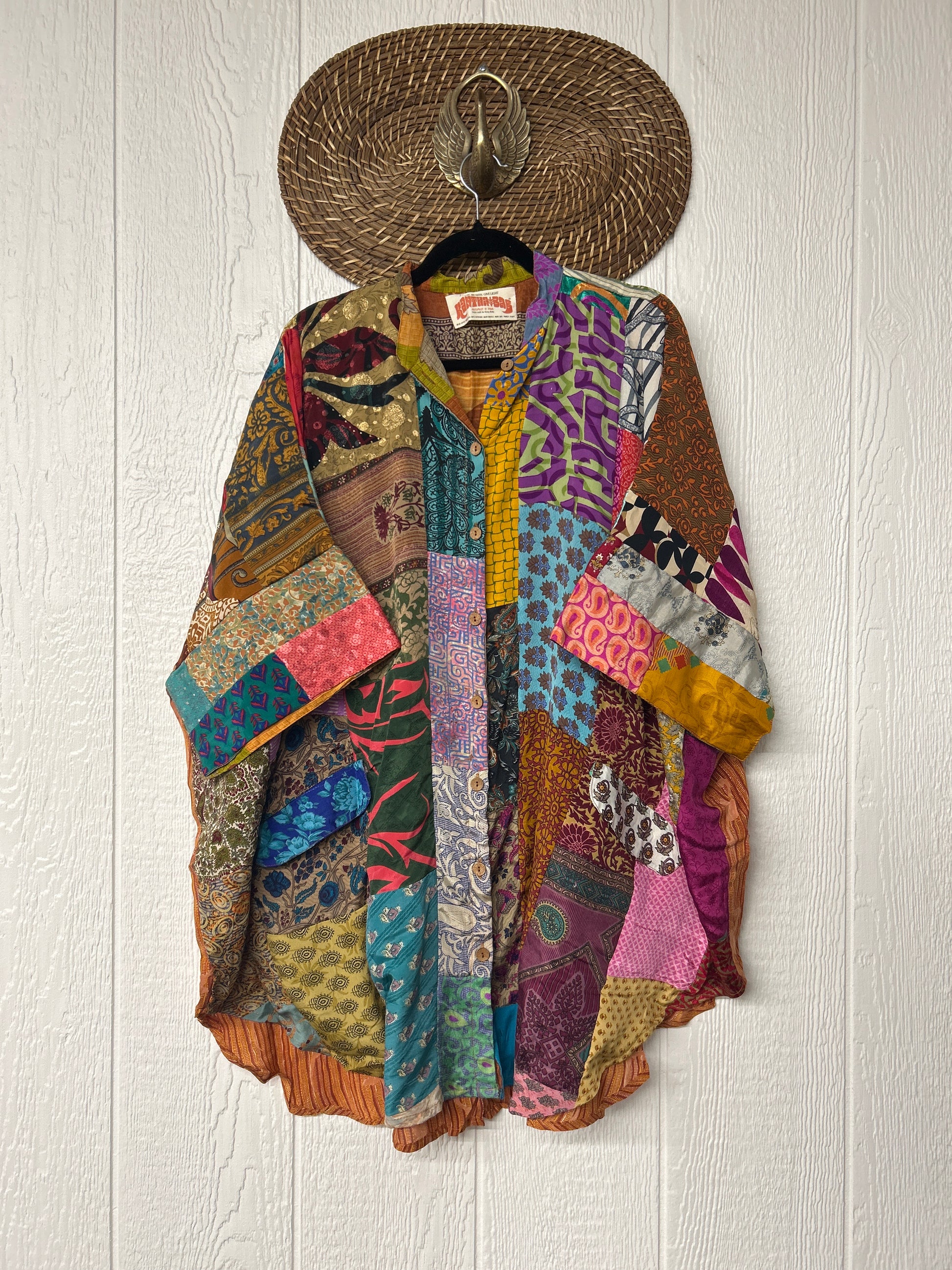 Made from hand-stitched patchwork vintage crepe sari, this billowy dream is fully lined in the front with cotton sari. Features a crepe panel in the back, functional buttons, two slouchy pockets in the front, and a curved bottom.
