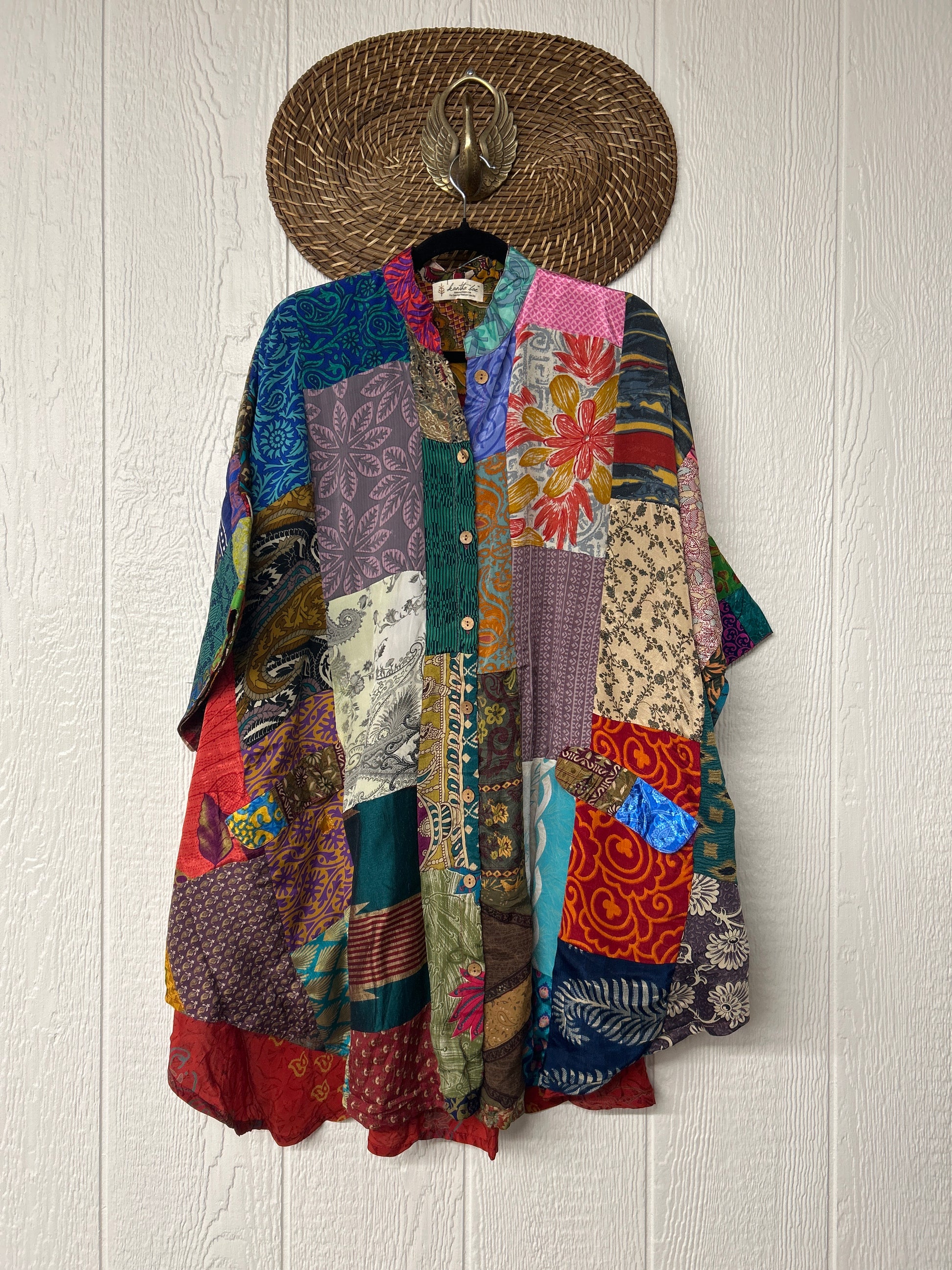 Made from hand-stitched patchwork vintage crepe sari, this billowy dream is fully lined in the front with cotton sari. Features a crepe panel in the back, functional buttons, two slouchy pockets in the front, and a curved bottom.