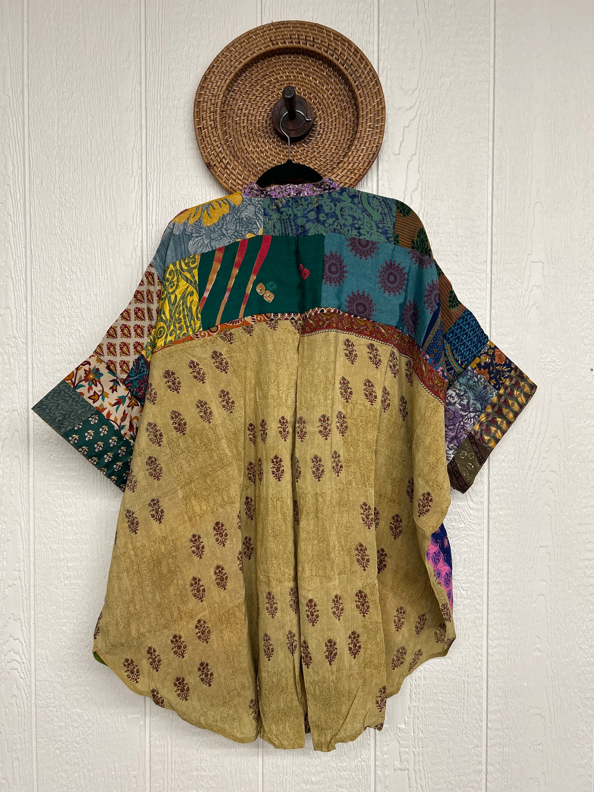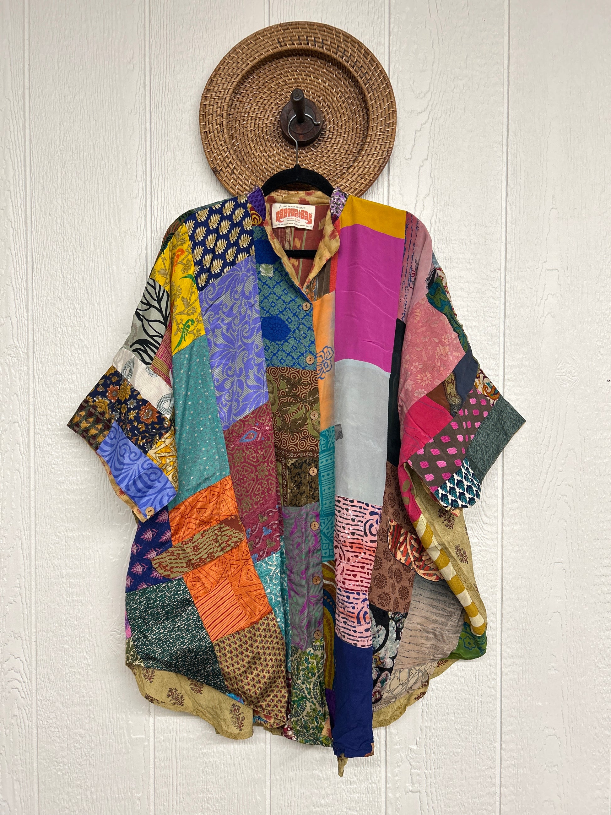 Made from hand-stitched patchwork vintage crepe sari, this billowy dream is fully lined in the front with cotton sari. Features a crepe panel in the back, functional buttons, two slouchy pockets in the front, and a curved bottom.