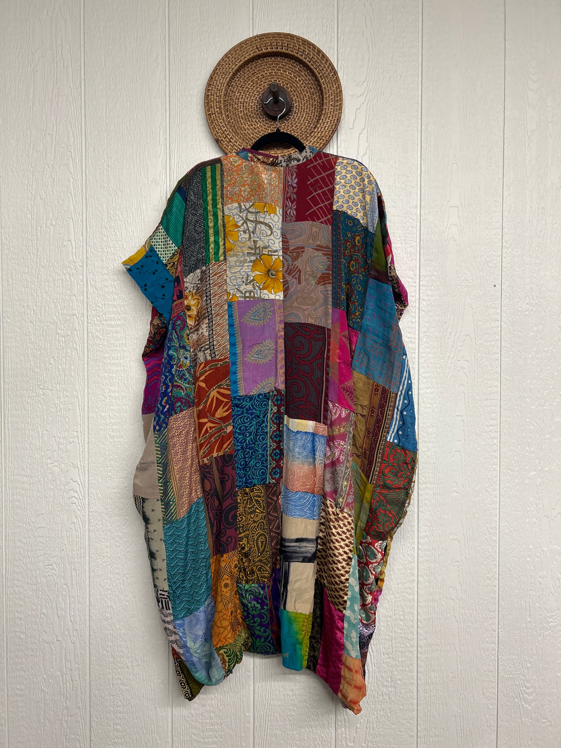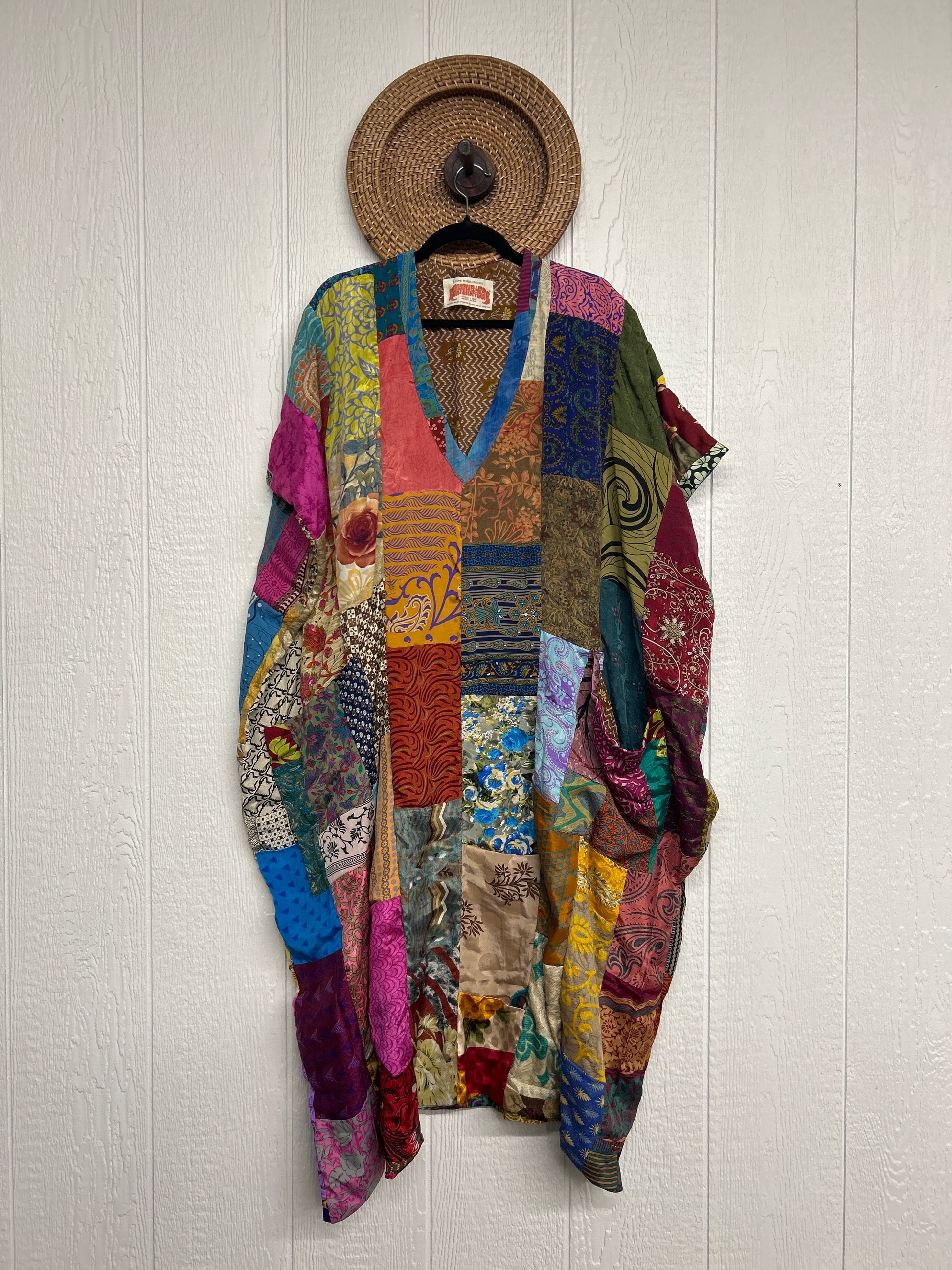 Patchwork outer garment is made from upcycled vintage rasgulla and crepe and fully lined in printed cotton sari. Features slouchy outer pockets, a v neckline and side slits for extra dimension.