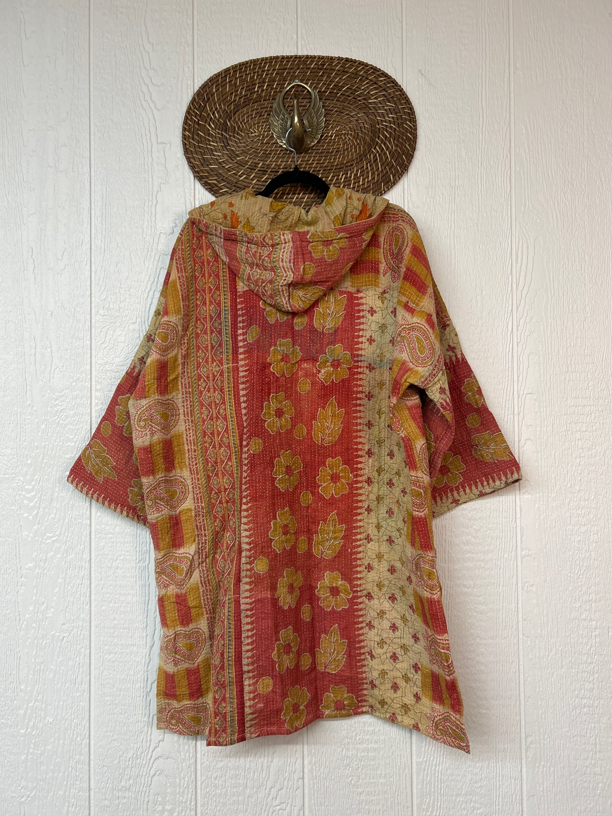 Cozy up in our Half Moon Shacket! Crafted from our ultra lux fine kantha stitched vintage cotton sari, the Half Moon Shacket features a hood, Button-down placket, deep front pockets and bell sleeves.