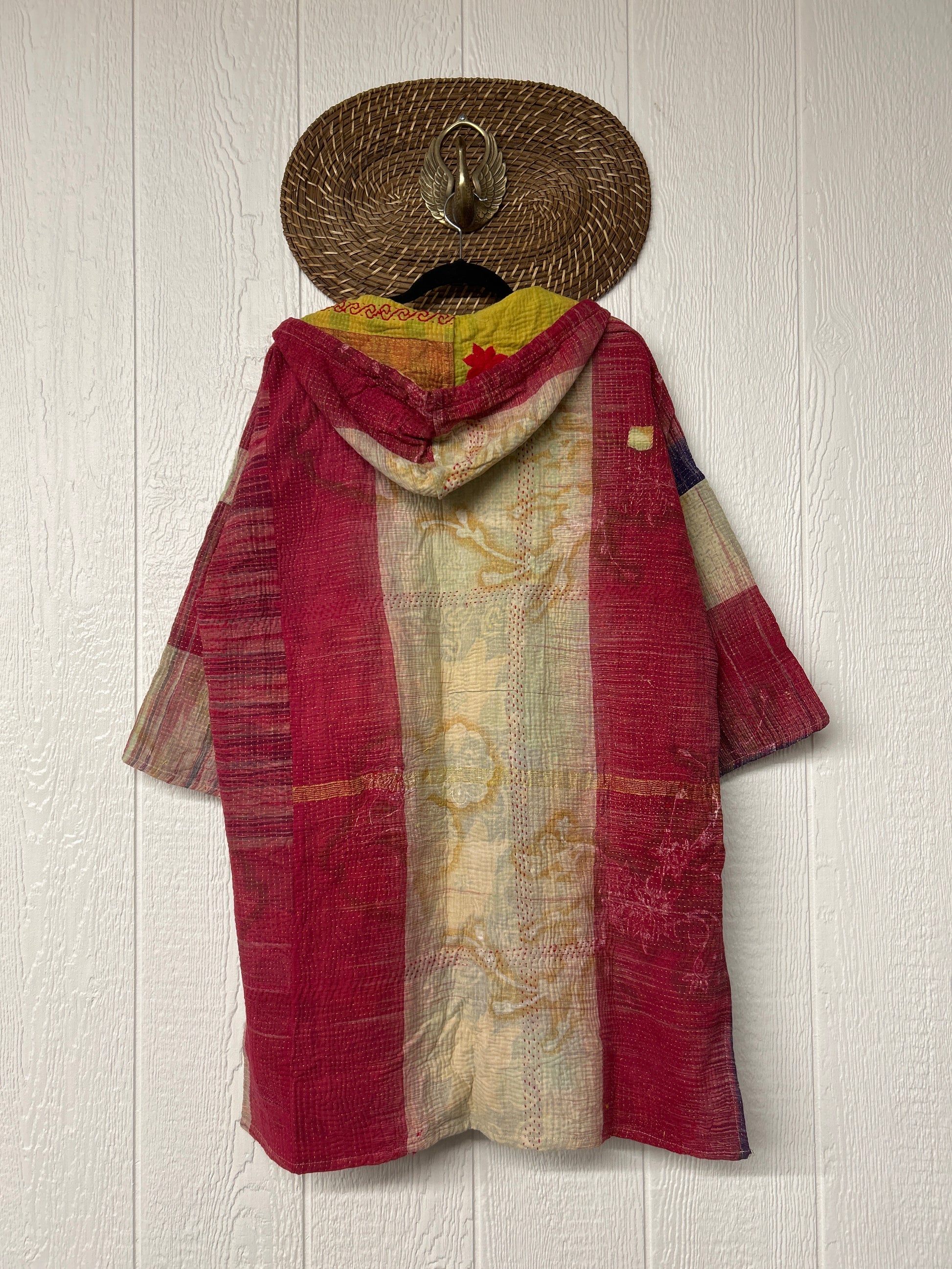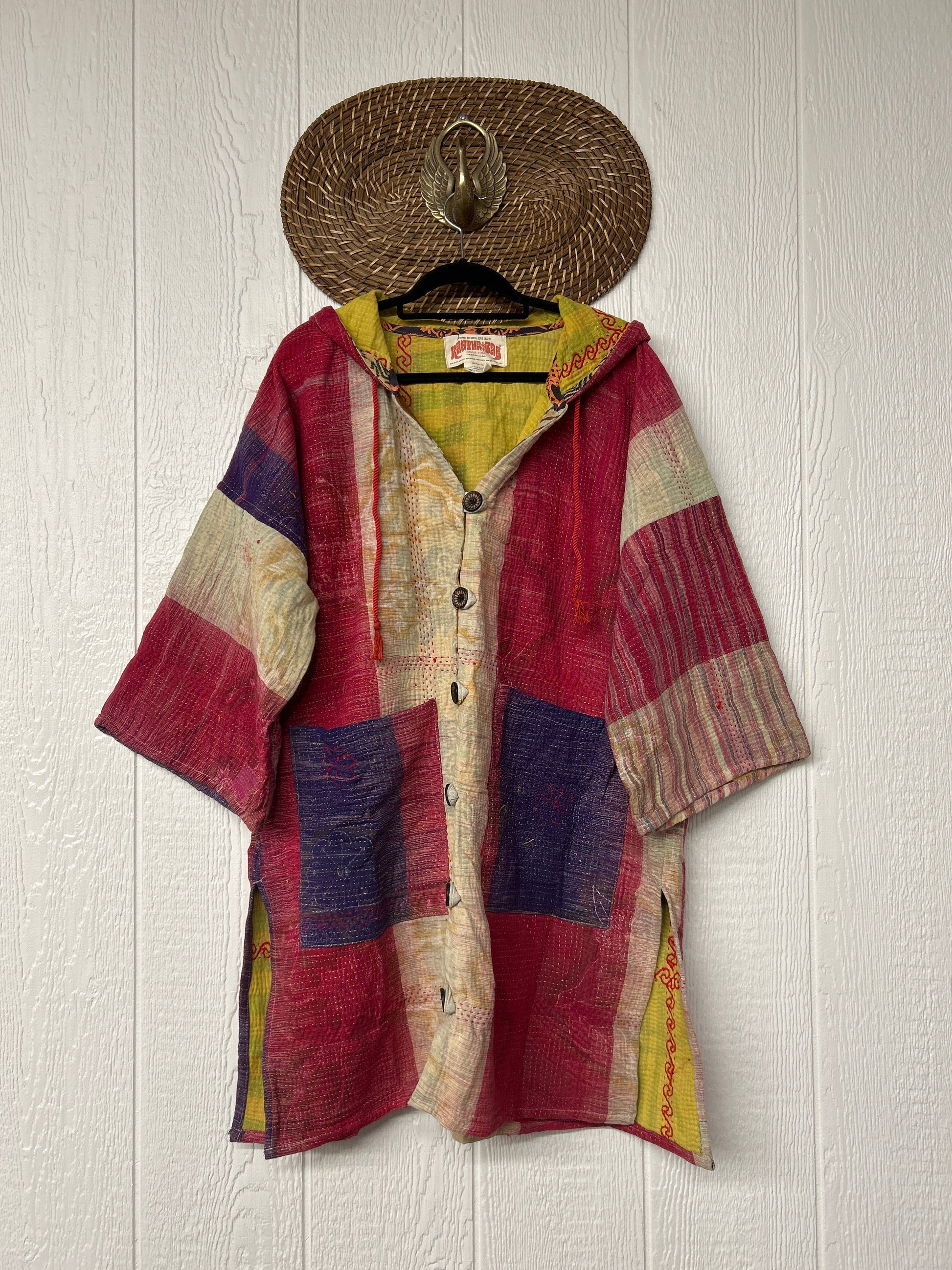 Cozy up in our Half Moon Shacket! Crafted from our ultra lux fine kantha stitched vintage cotton sari, the Half Moon Shacket features a hood, Button-down placket, deep front pockets and bell sleeves.