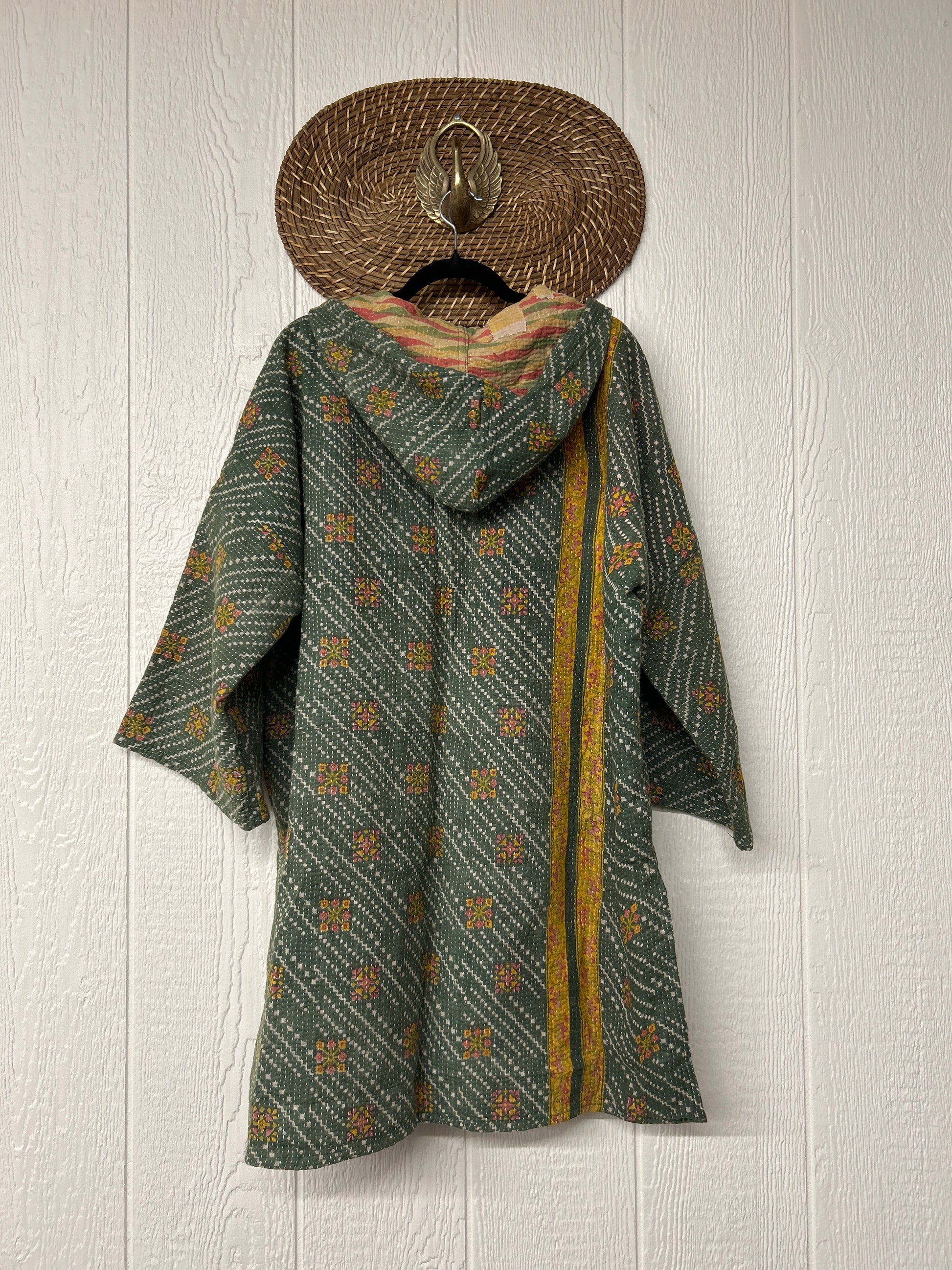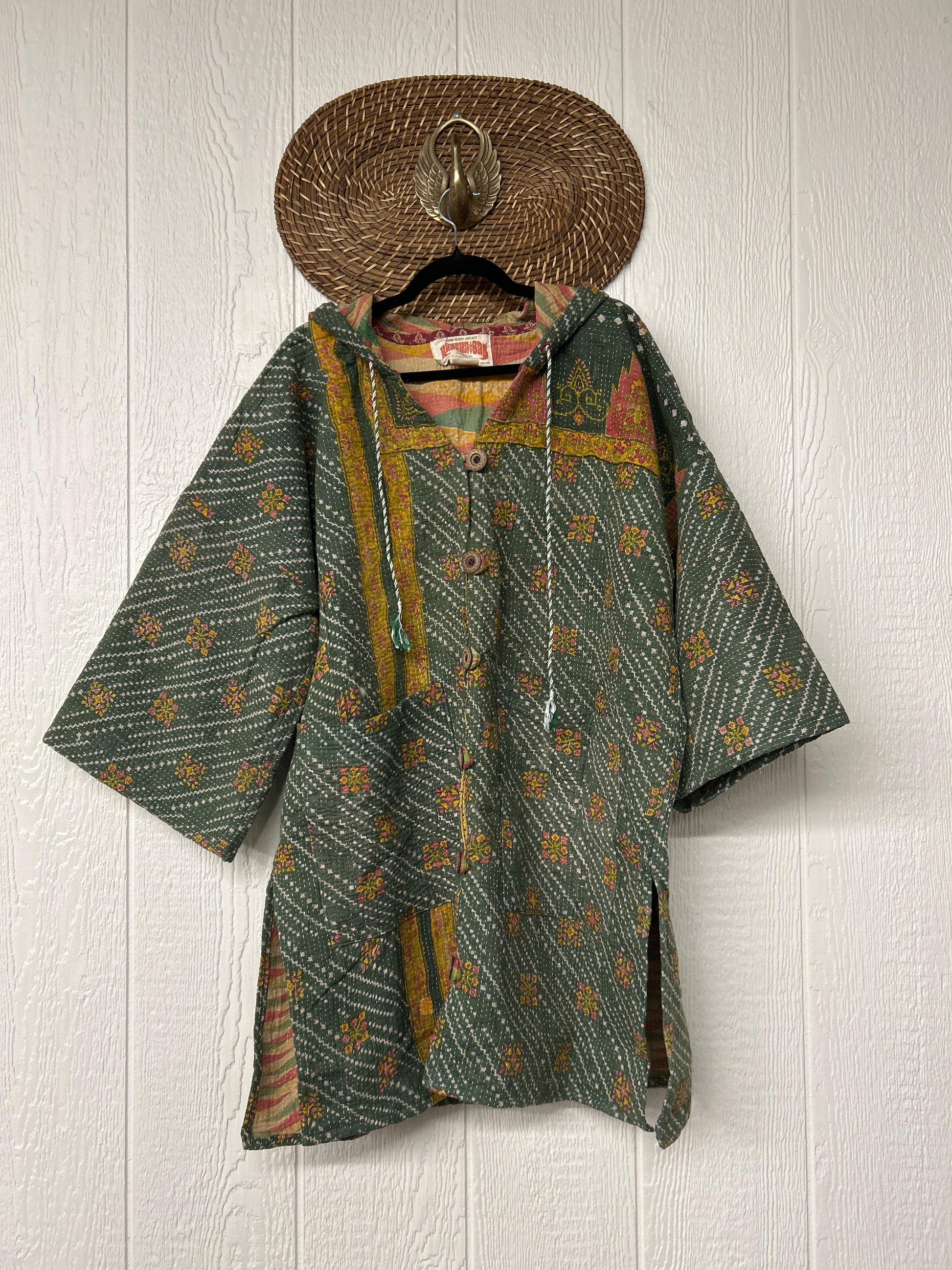 Cozy up in our Half Moon Shacket! Crafted from our ultra lux fine kantha stitched vintage cotton sari, the Half Moon Shacket features a hood, Button-down placket, deep front pockets and bell sleeves.