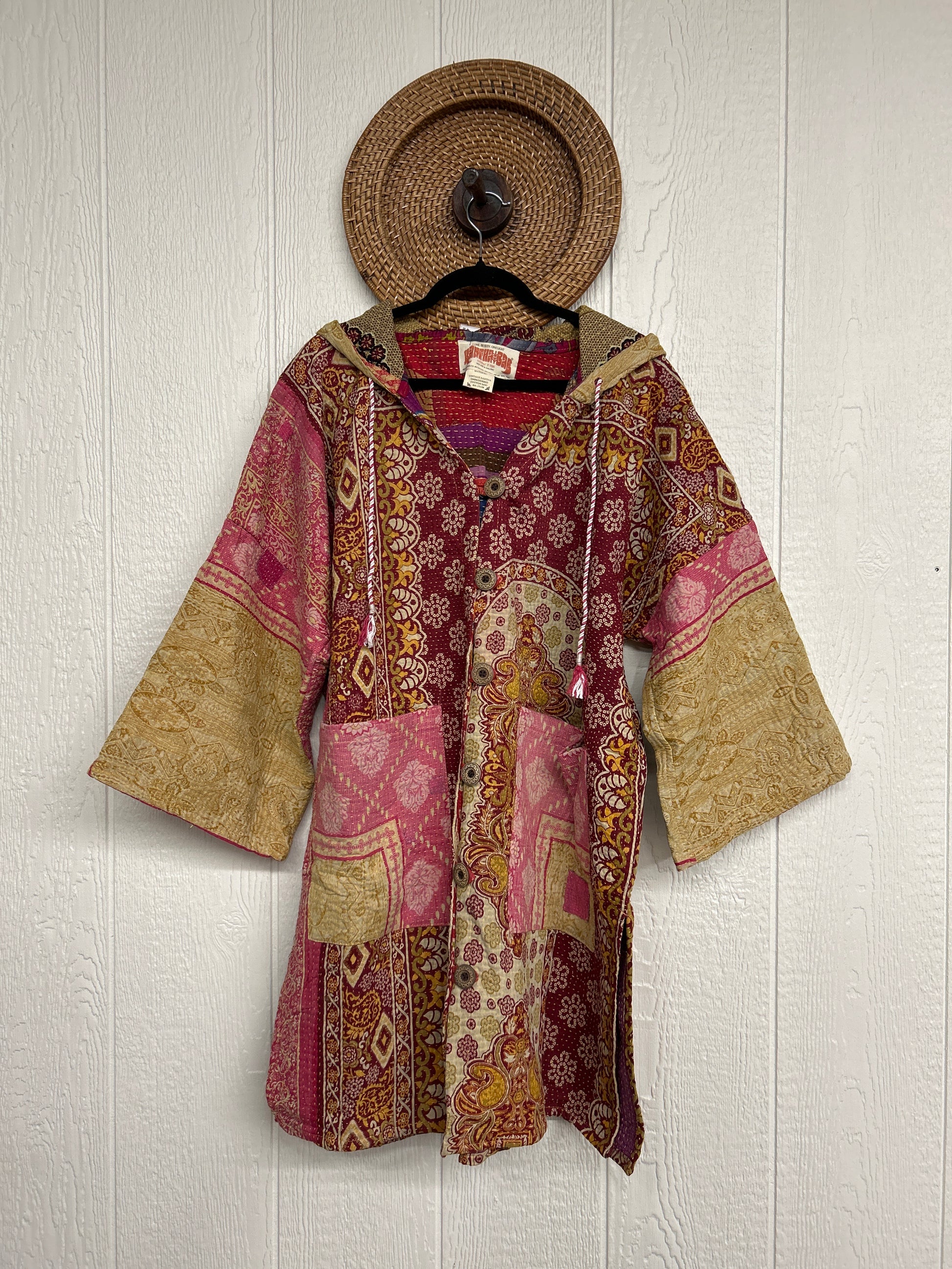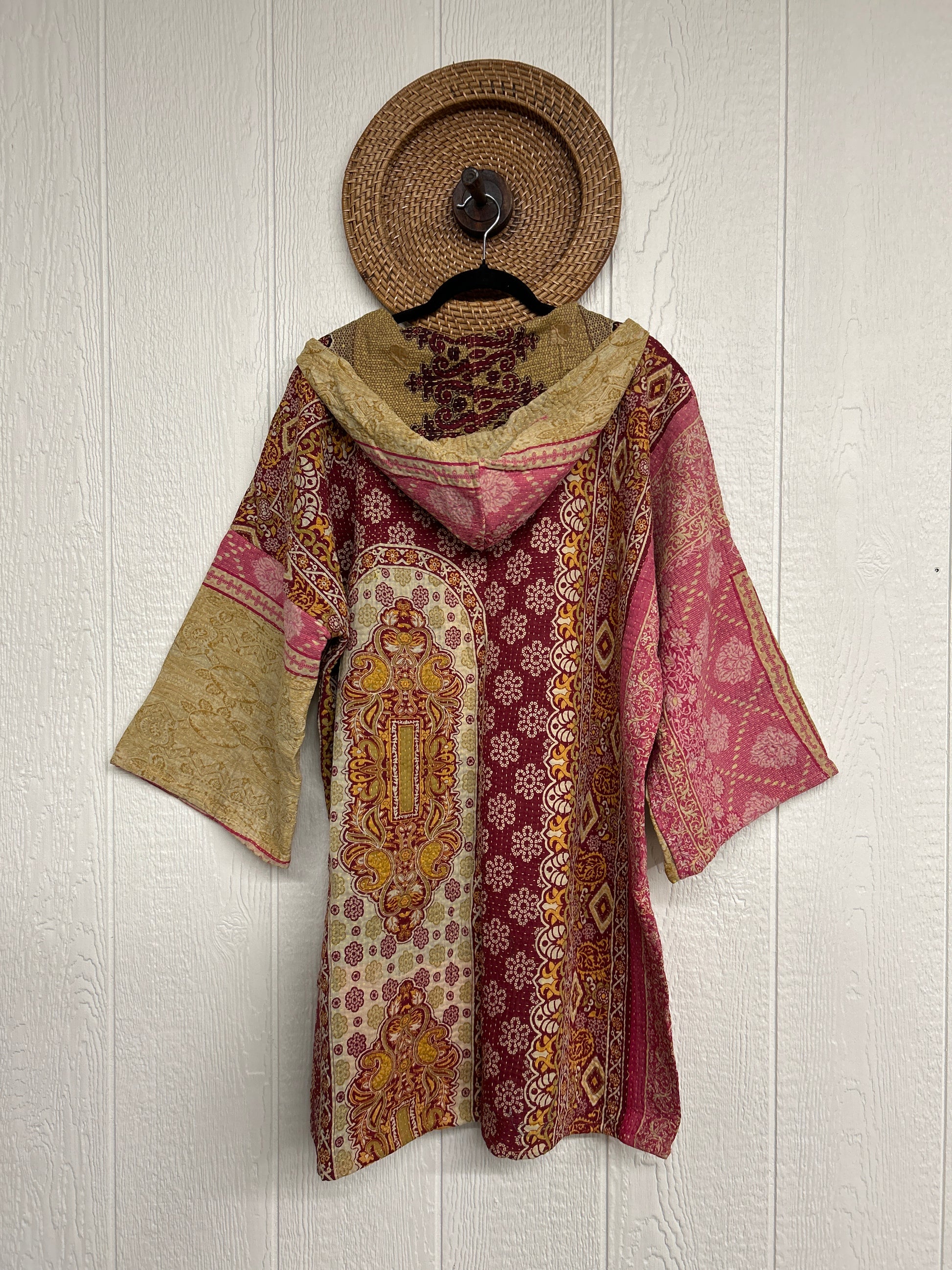 Cozy up in our Half Moon Shacket! Crafted from our ultra lux fine kantha stitched vintage cotton sari, the Half Moon Shacket features a hood, Button-down placket, deep front pockets and bell sleeves.