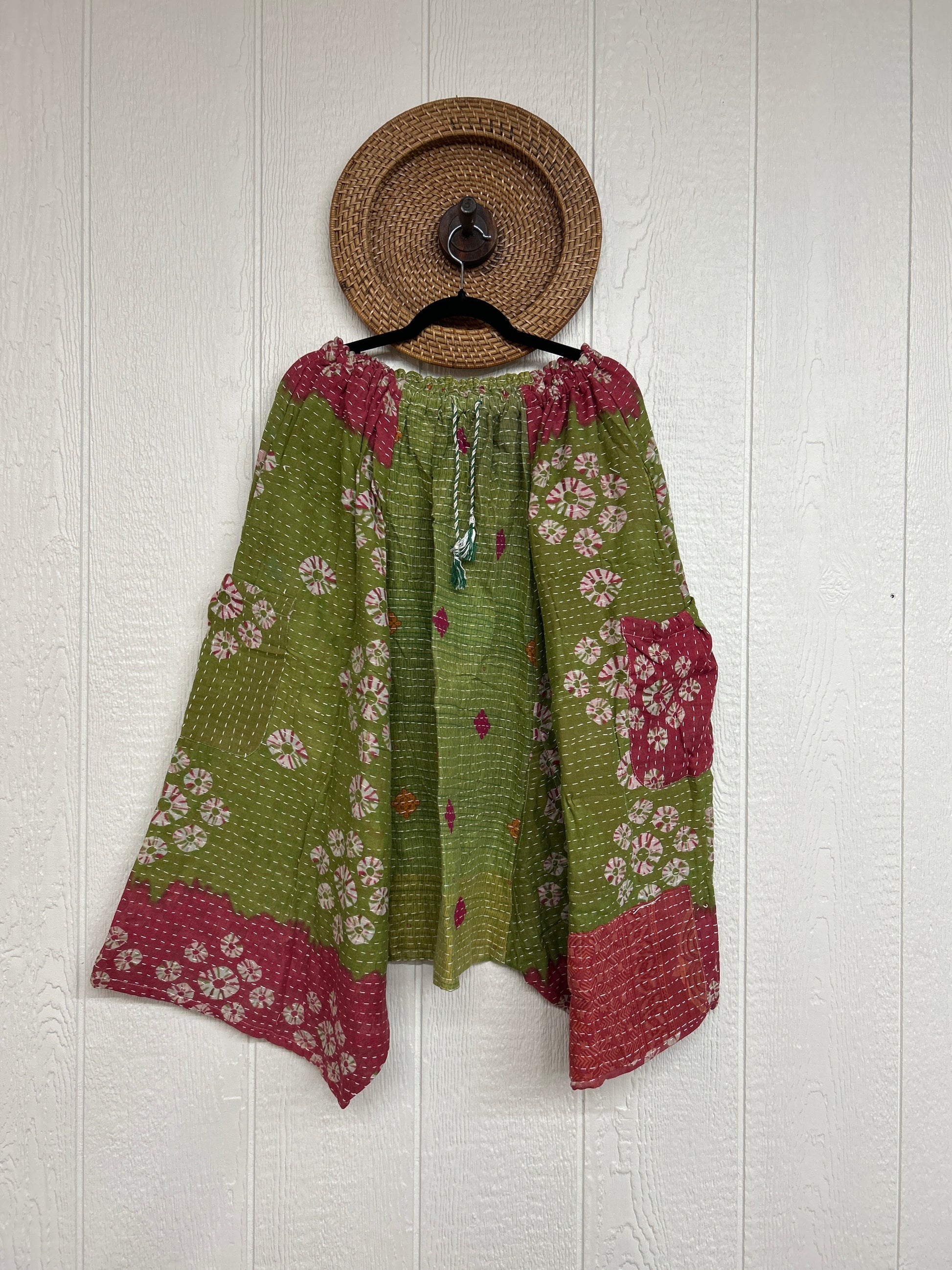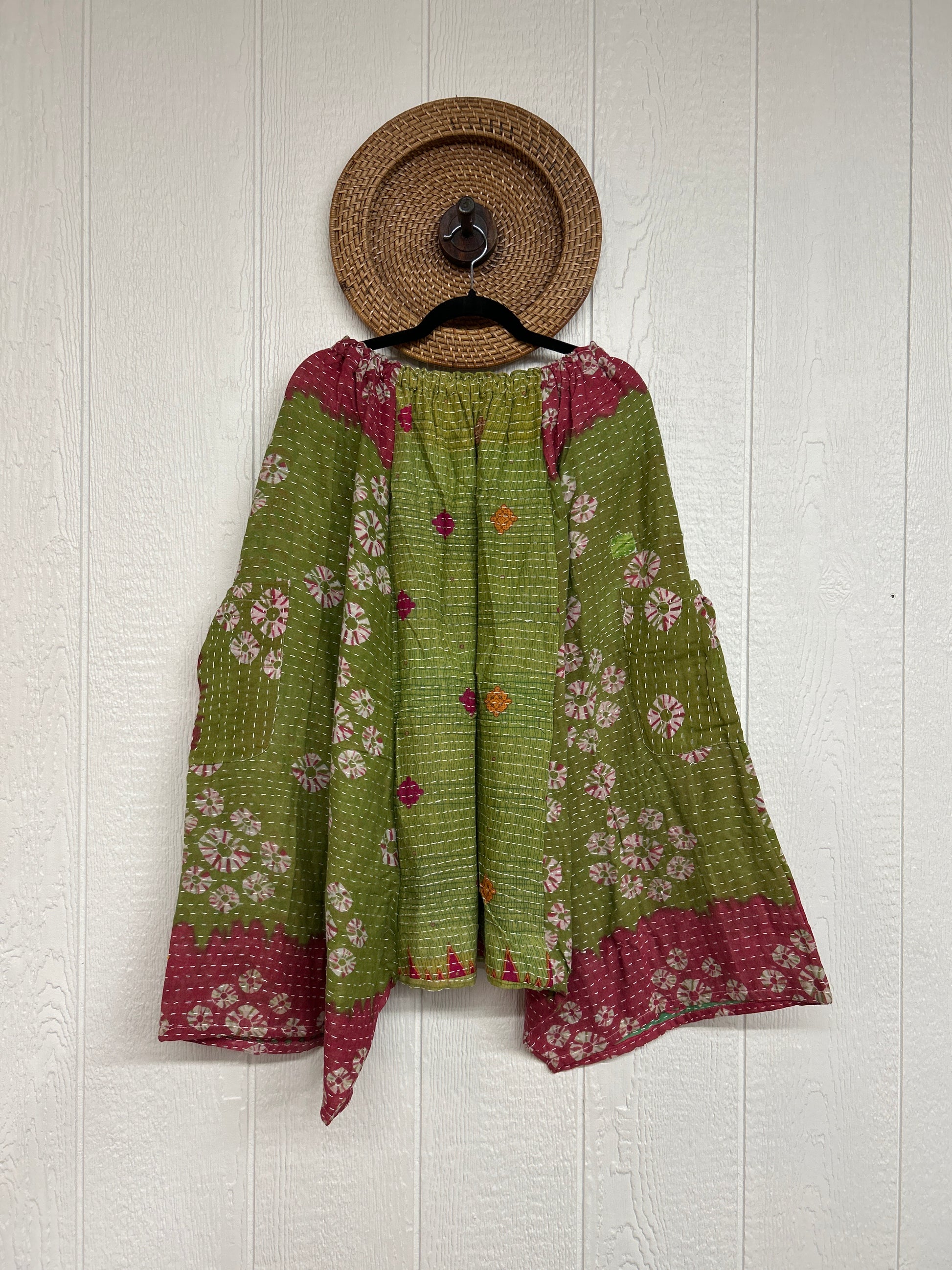 Fabrics may have small threads or holes in the layers. Color inconsistency or small stains may be present. The saris are sewn together and extend the life of each design. Imperfections should be celebrated.