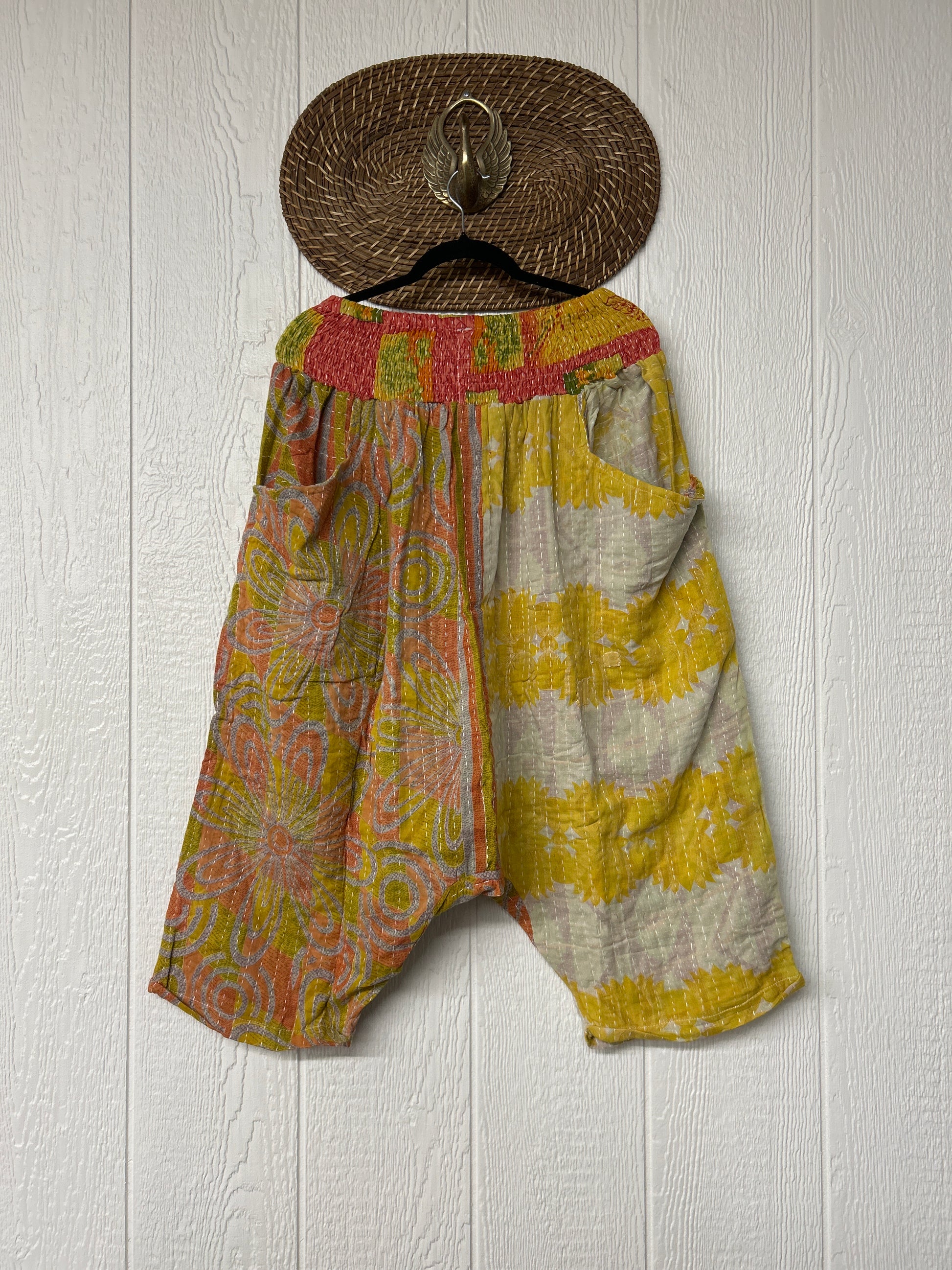 Crafted from our ultra lux embroidered vintage cotton sari coverlet these pants will make you want to dance. Features drop crotch, two front interior pockets, a back pocket and cropped length. These pants can be worn with either set of pockets to the front or back AND they are fully reversible. Yes, you can wear them 4 ways!