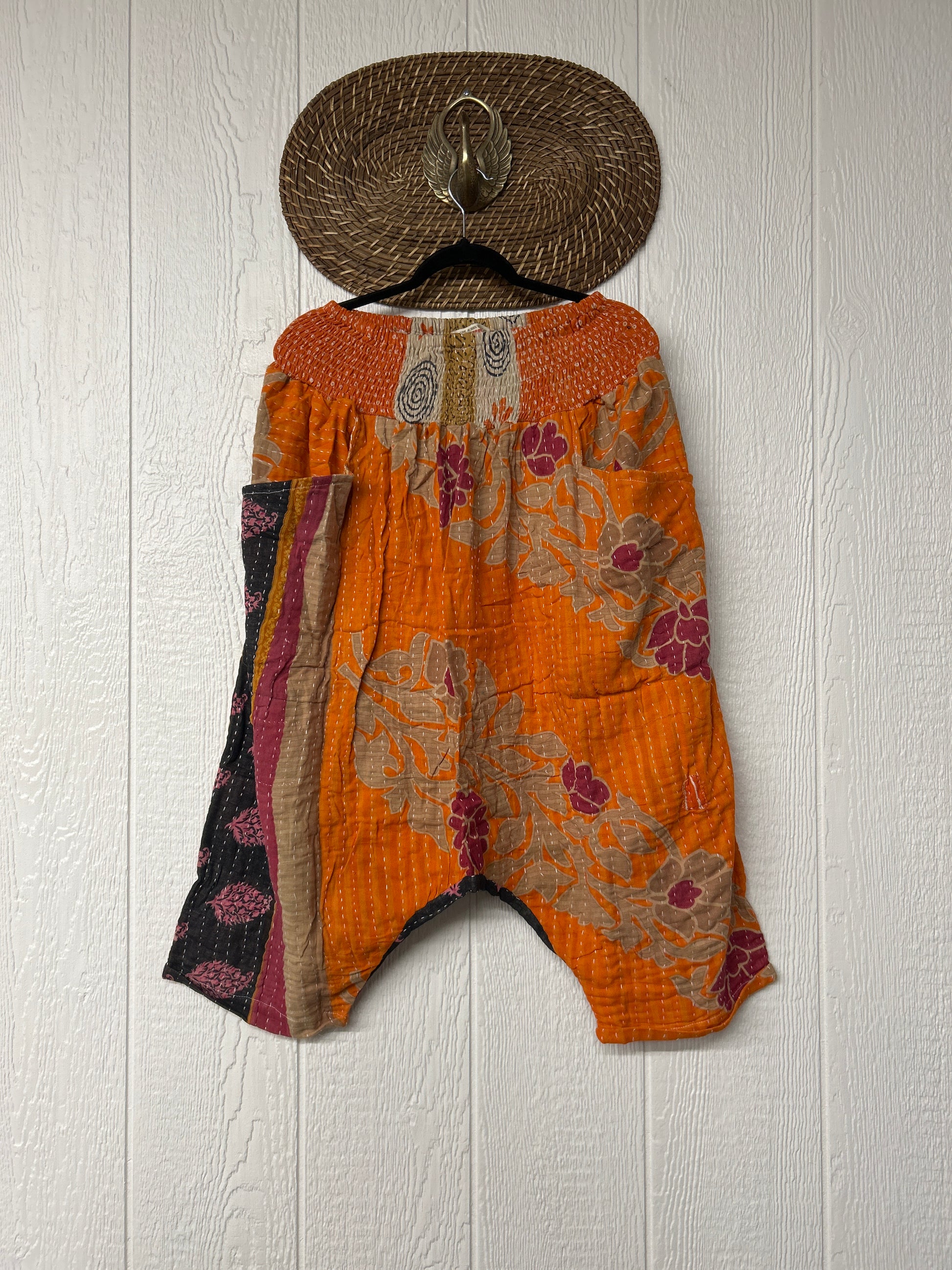 Crafted from our ultra lux embroidered vintage cotton sari coverlet these pants will make you want to dance. Features drop crotch, two front interior pockets, a back pocket and cropped length. These pants can be worn with either set of pockets to the front or back AND they are fully reversible. Yes, you can wear them 4 ways!
