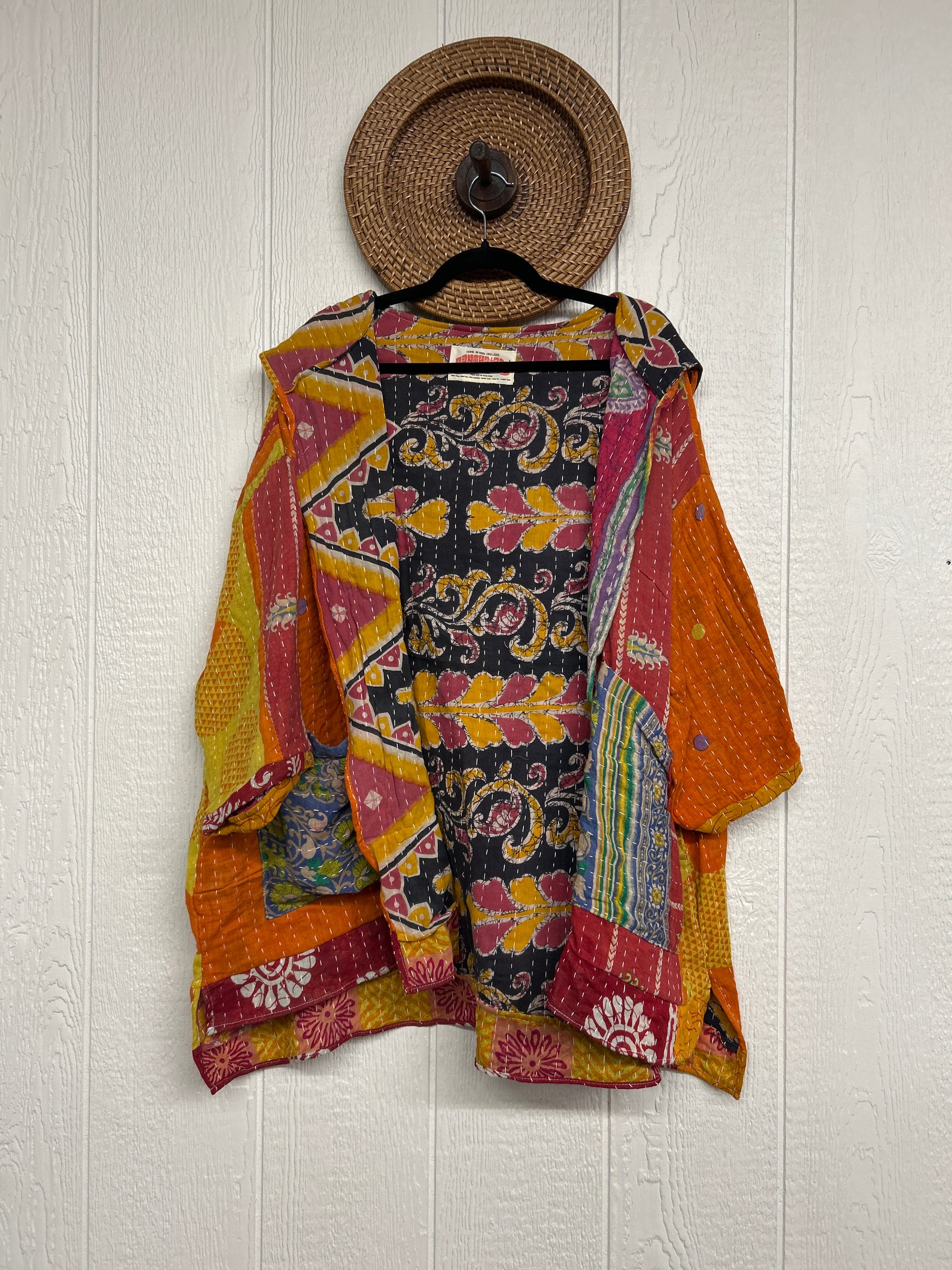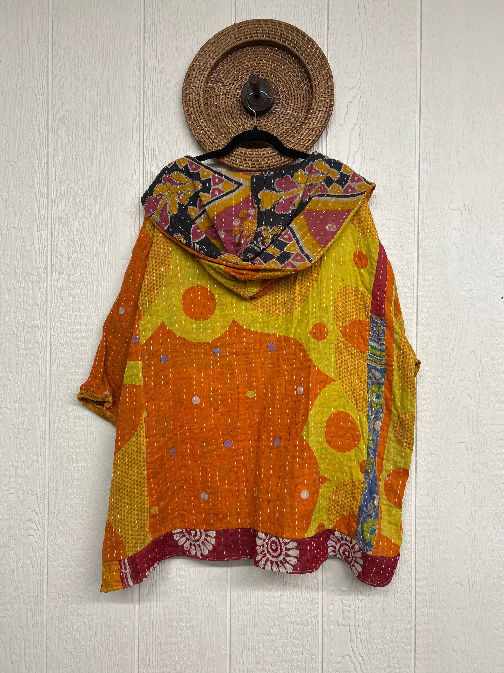 Crafted from koverlet kantha stitched cotton sari this slouchy hoodie features two exterior slouchy pockets for your treasures, a high low hem, hood, and open front for layering versatility.