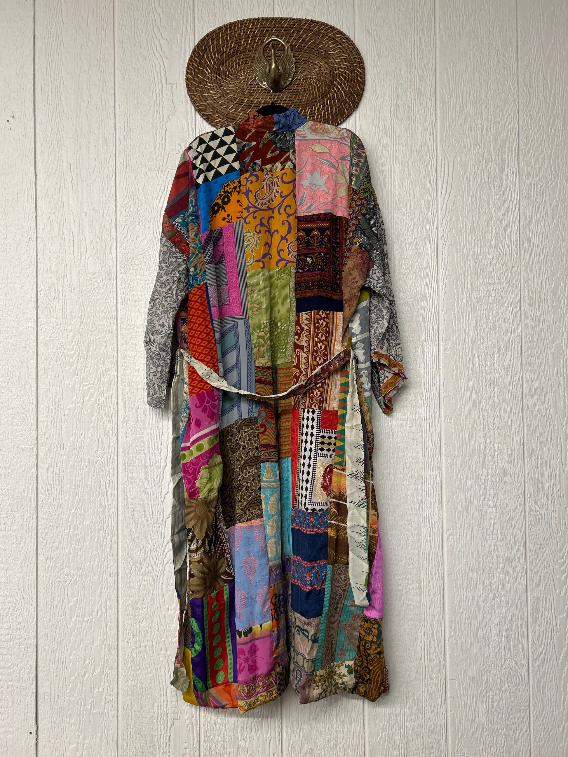 Patchwork outer garment is made from rasgulla and crepe sari and fully lined in printed cotton sari. Features slouchy outer pockets and a tie sash closure. Wide sleeves are crafted from unlined crepe silk for extra dimension.