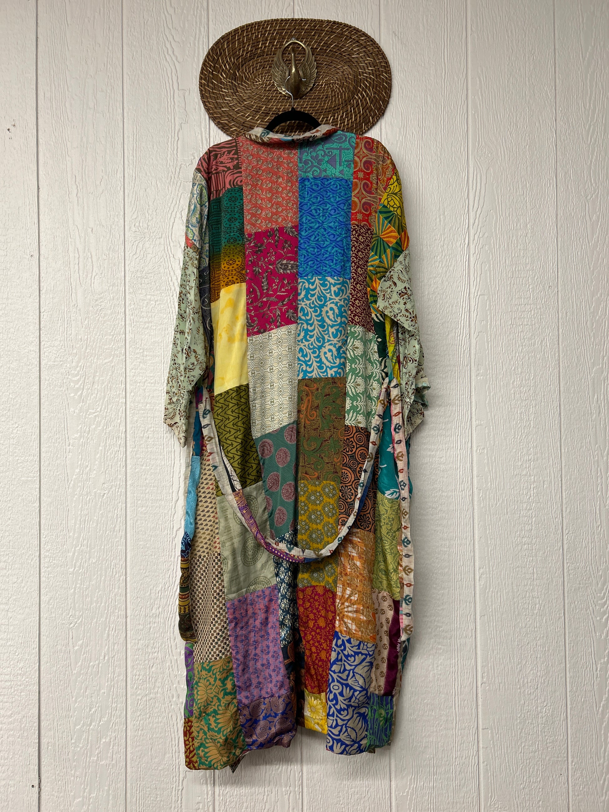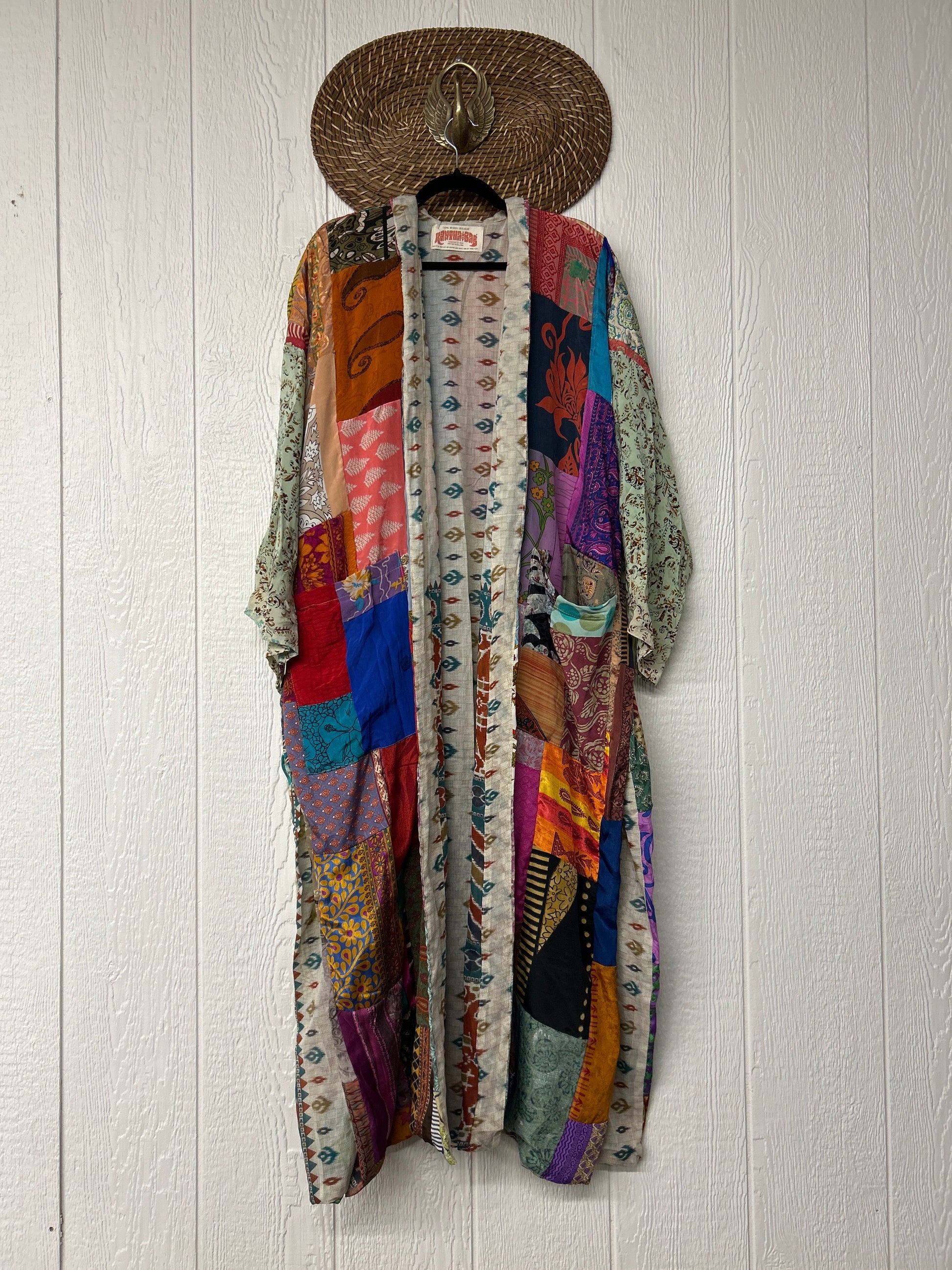 Patchwork outer garment is made from rasgulla and crepe sari and fully lined in printed cotton sari. Features slouchy outer pockets and a tie sash closure. Wide sleeves are crafted from unlined crepe silk for extra dimension.