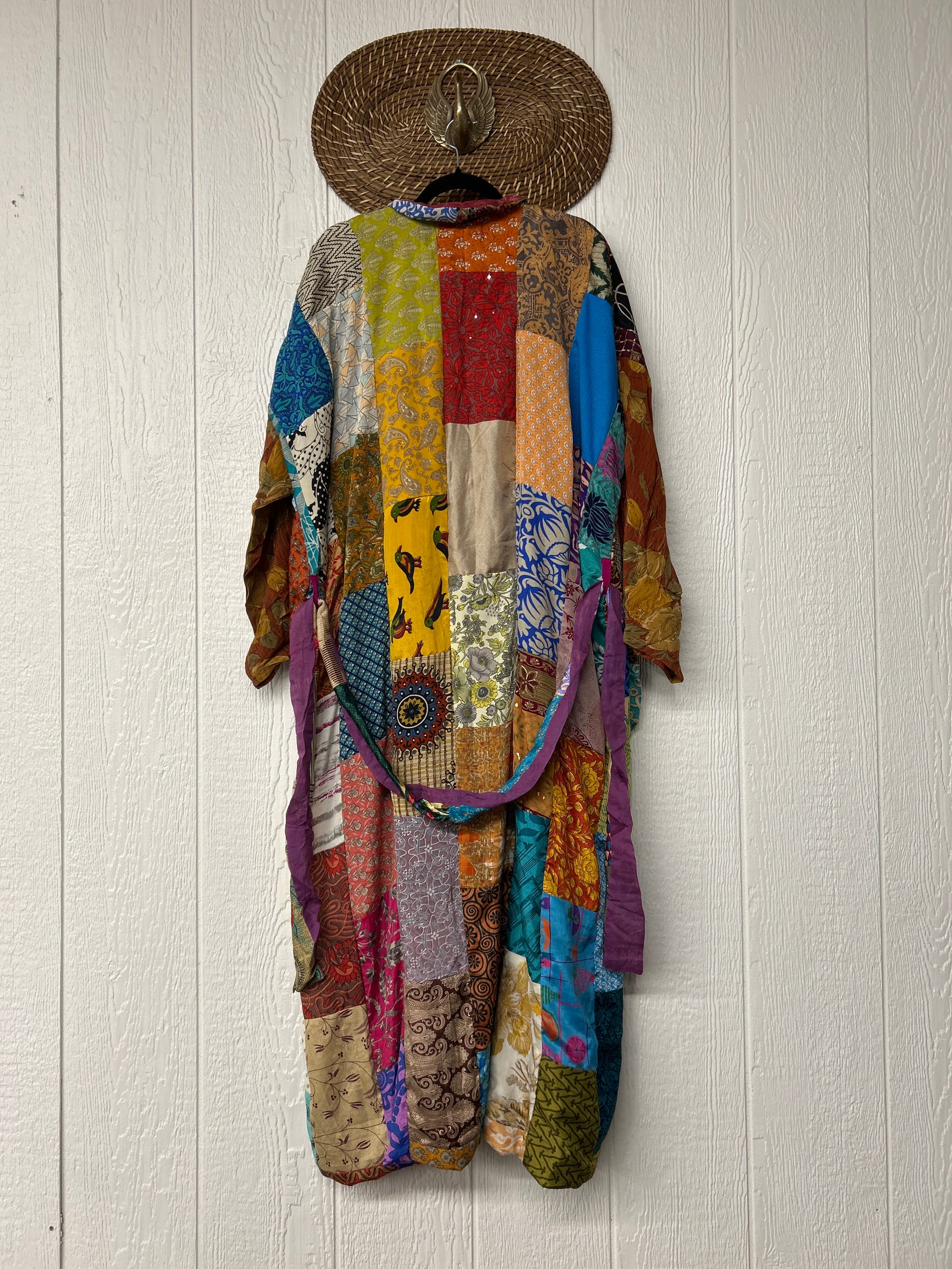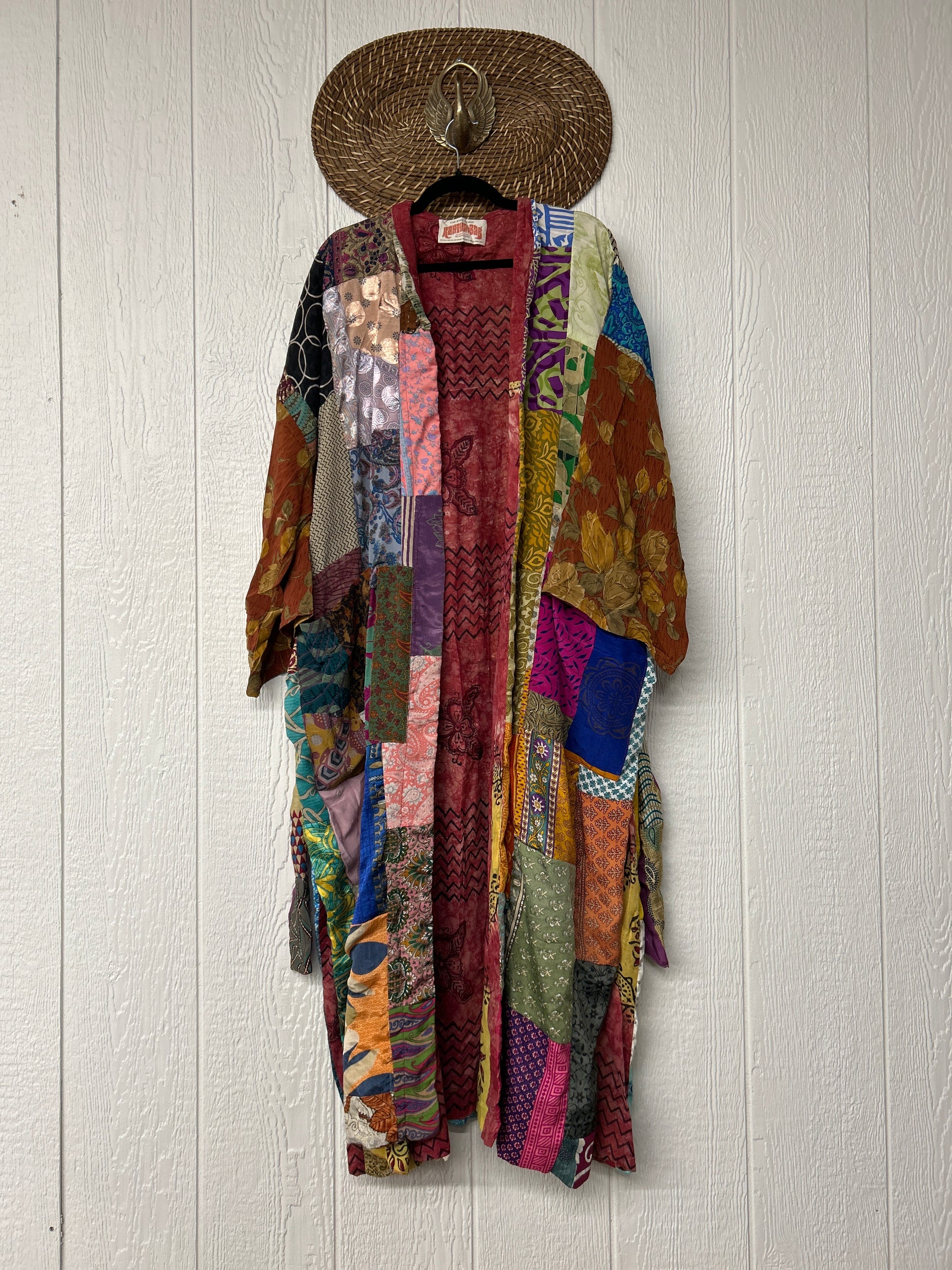 Patchwork outer garment is made from rasgulla and crepe sari and fully lined in printed cotton sari. Features slouchy outer pockets and a tie sash closure. Wide sleeves are crafted from unlined crepe silk for extra dimension.