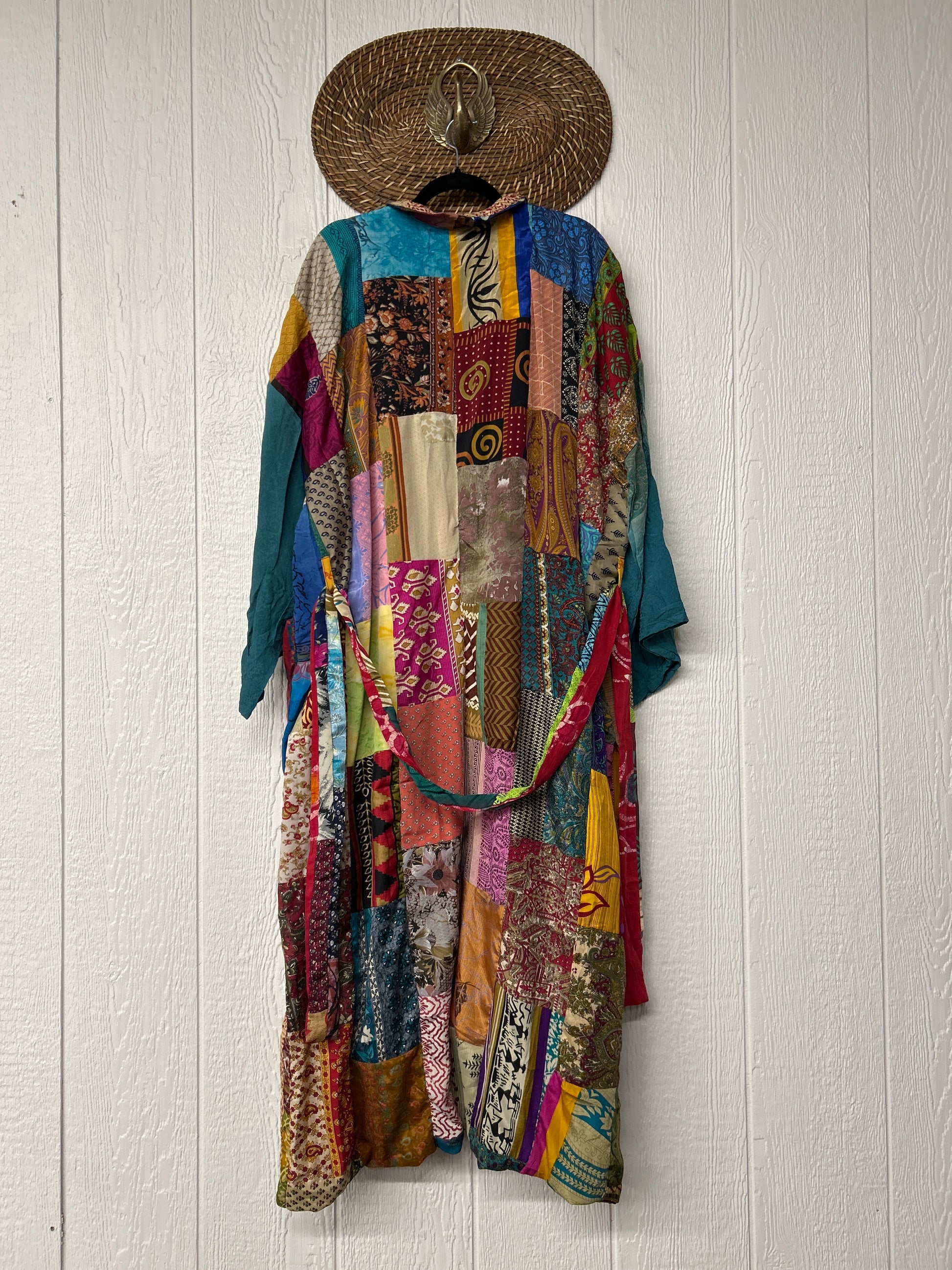 Patchwork outer garment is made from rasgulla and crepe sari and fully lined in printed cotton sari. Features slouchy outer pockets and a tie sash closure. Wide sleeves are crafted from unlined crepe silk for extra dimension.