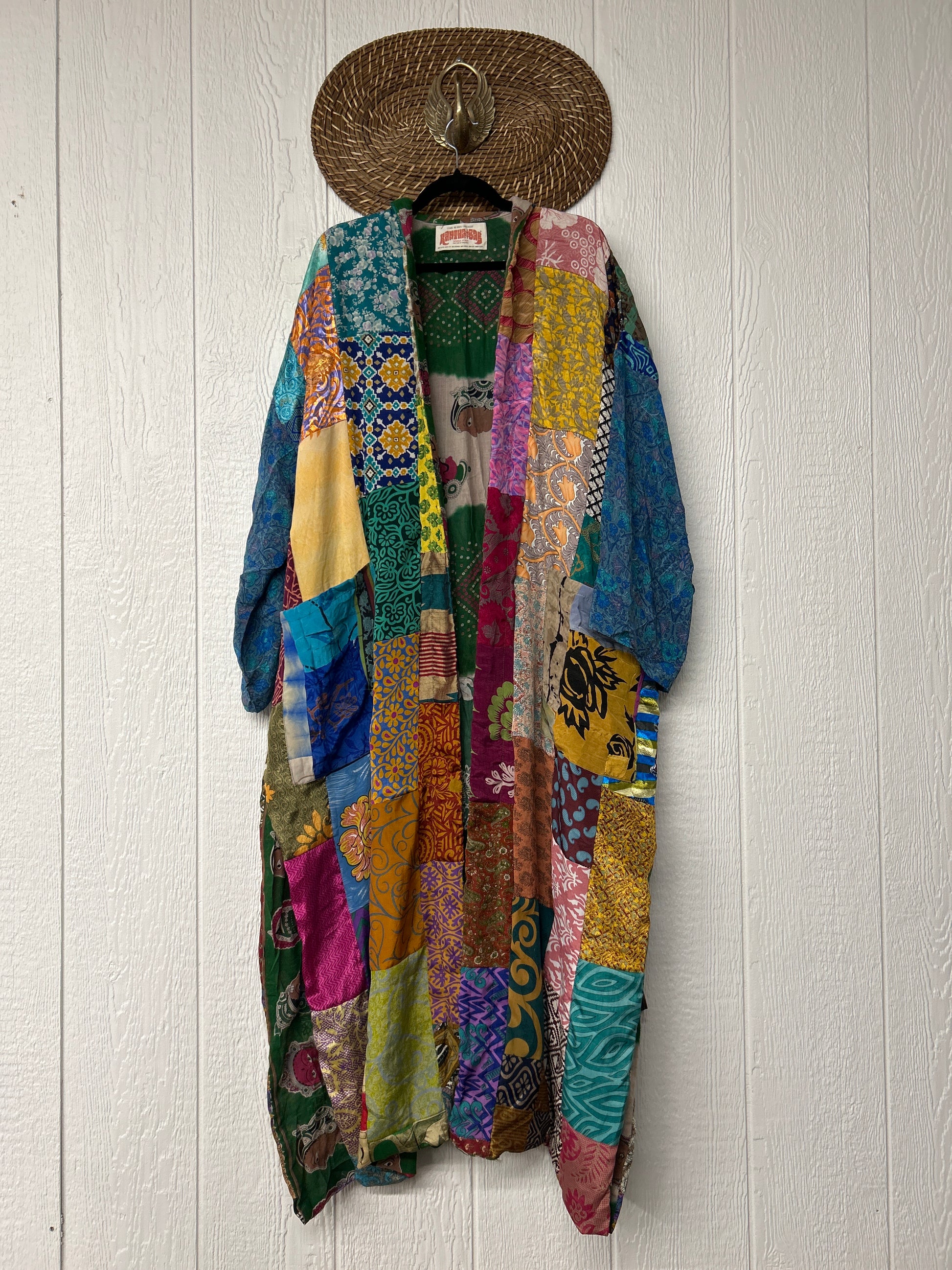 Patchwork outer garment is made from rasgulla and crepe sari and fully lined in printed cotton sari. Features slouchy outer pockets and a tie sash closure. Wide sleeves are crafted from unlined crepe silk for extra dimension.