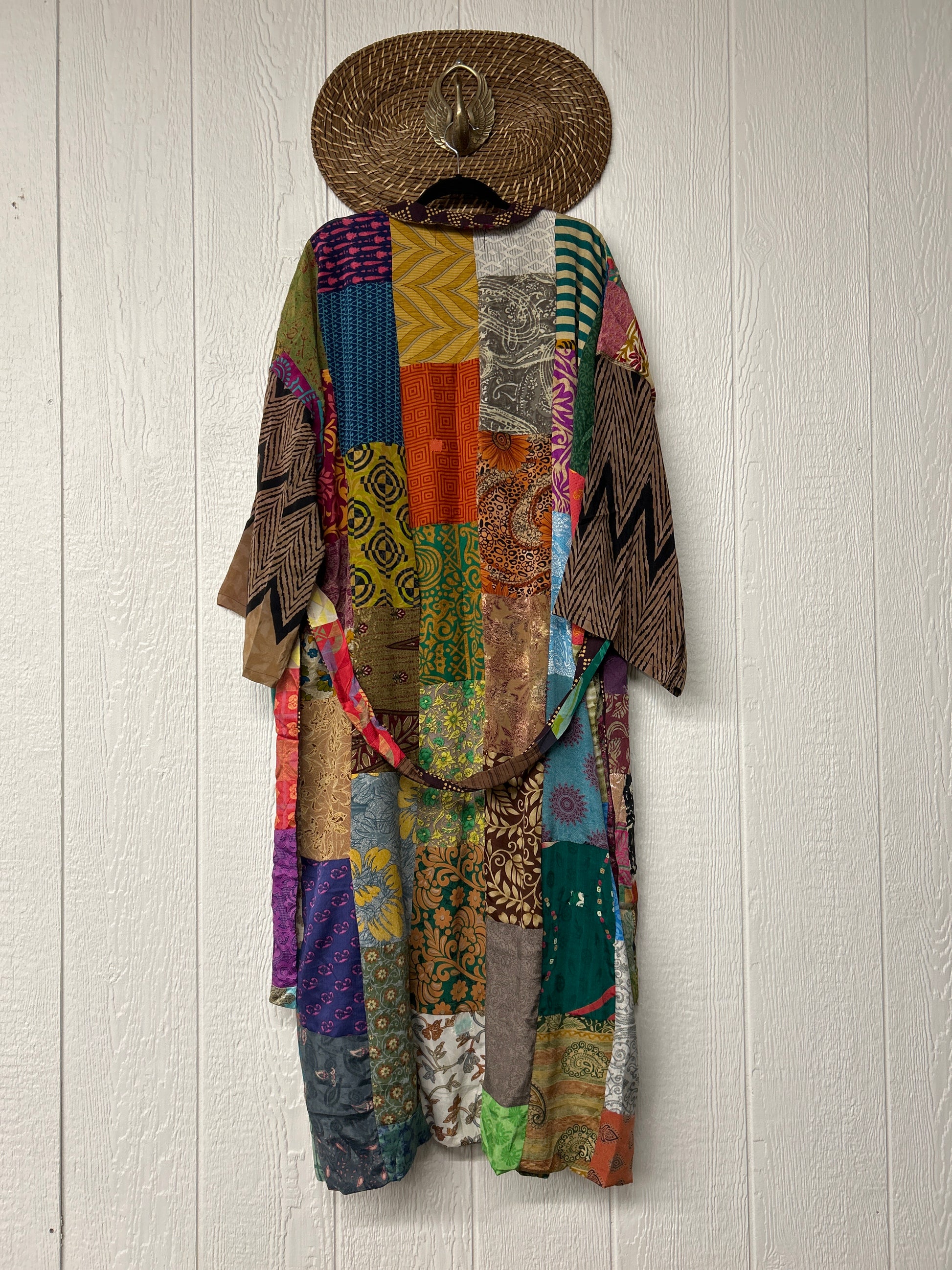 Patchwork outer garment is made from rasgulla and crepe sari and fully lined in printed cotton sari. Features slouchy outer pockets and a tie sash closure. Wide sleeves are crafted from unlined crepe silk for extra dimension.