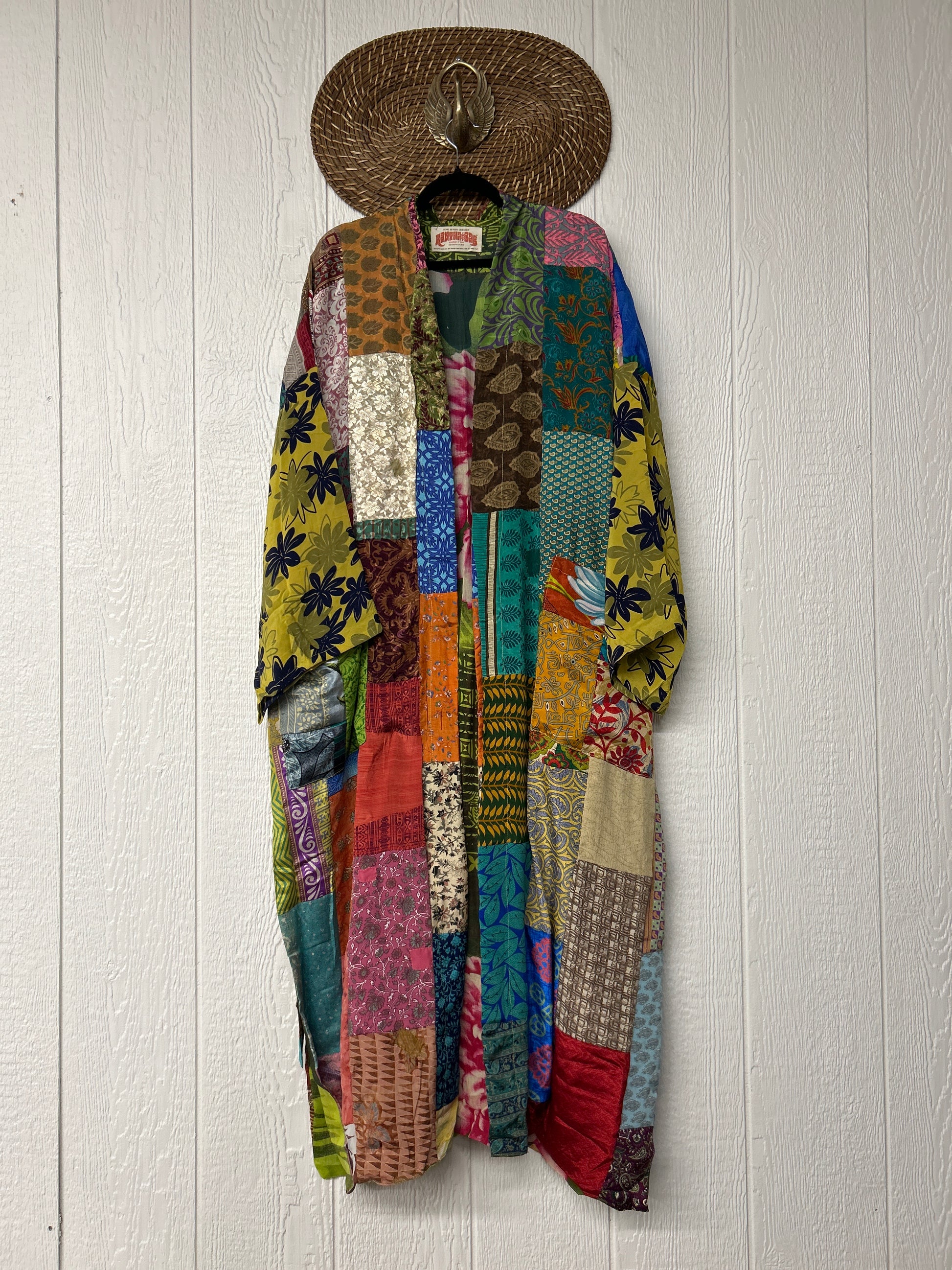 Patchwork outer garment is made from rasgulla and crepe sari and fully lined in printed cotton sari. Features slouchy outer pockets and a tie sash closure. Wide sleeves are crafted from unlined crepe silk for extra dimension.